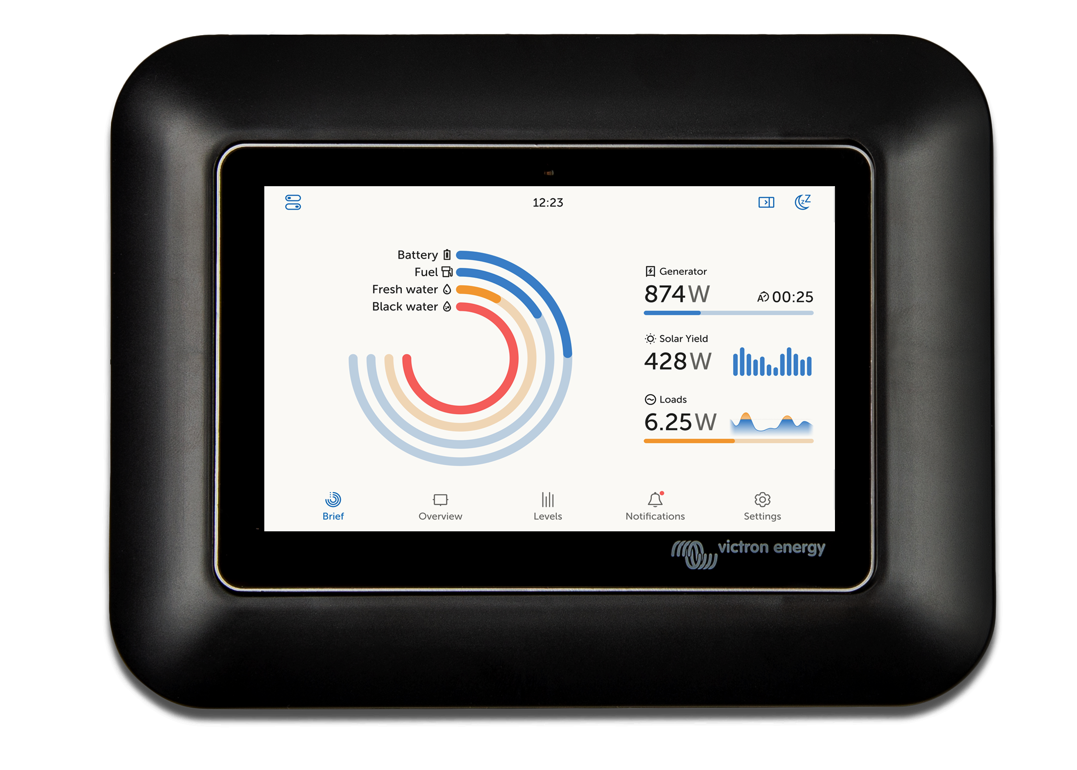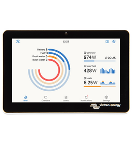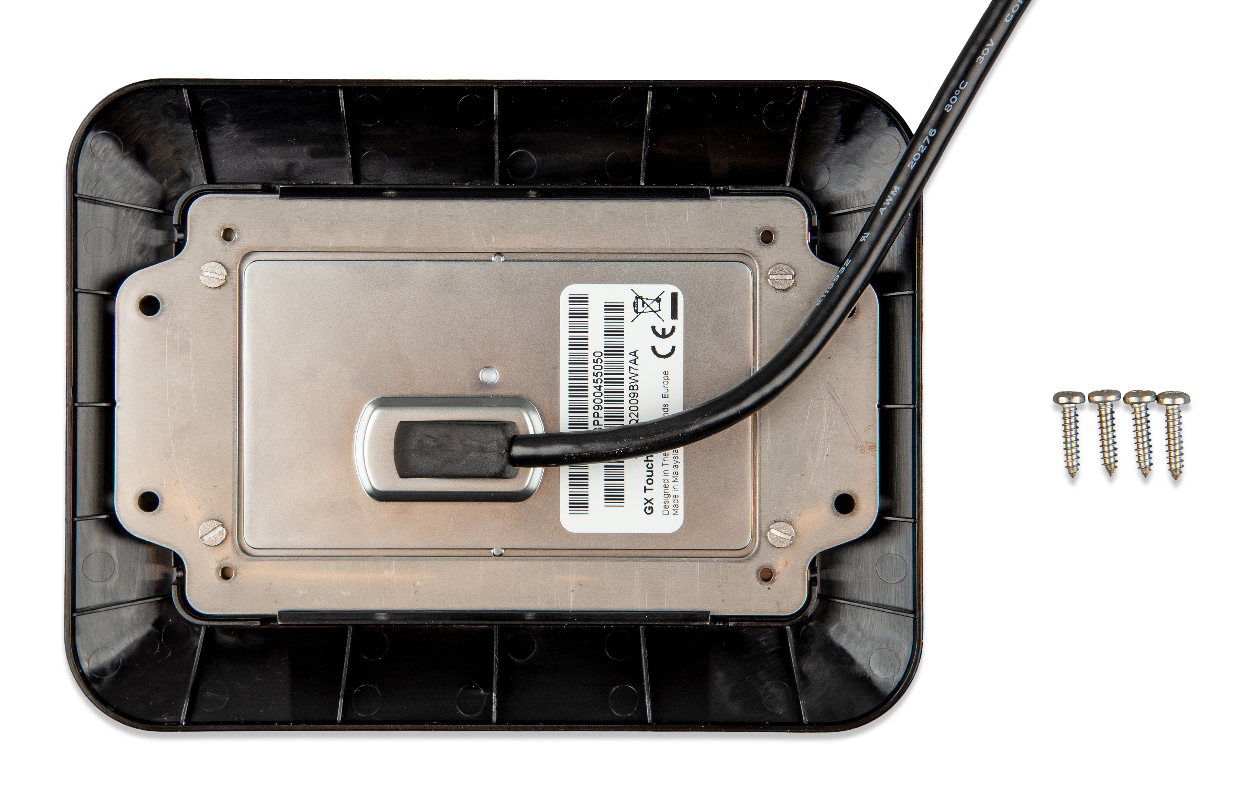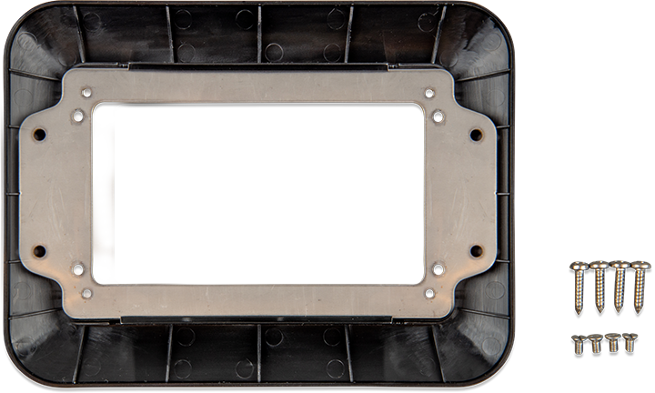 This adapter is designed to easily replace the CCGX display with the newer GX Touch. Contents of the packaging are the metal bracket, the plastic bezel, and four mounting screws.