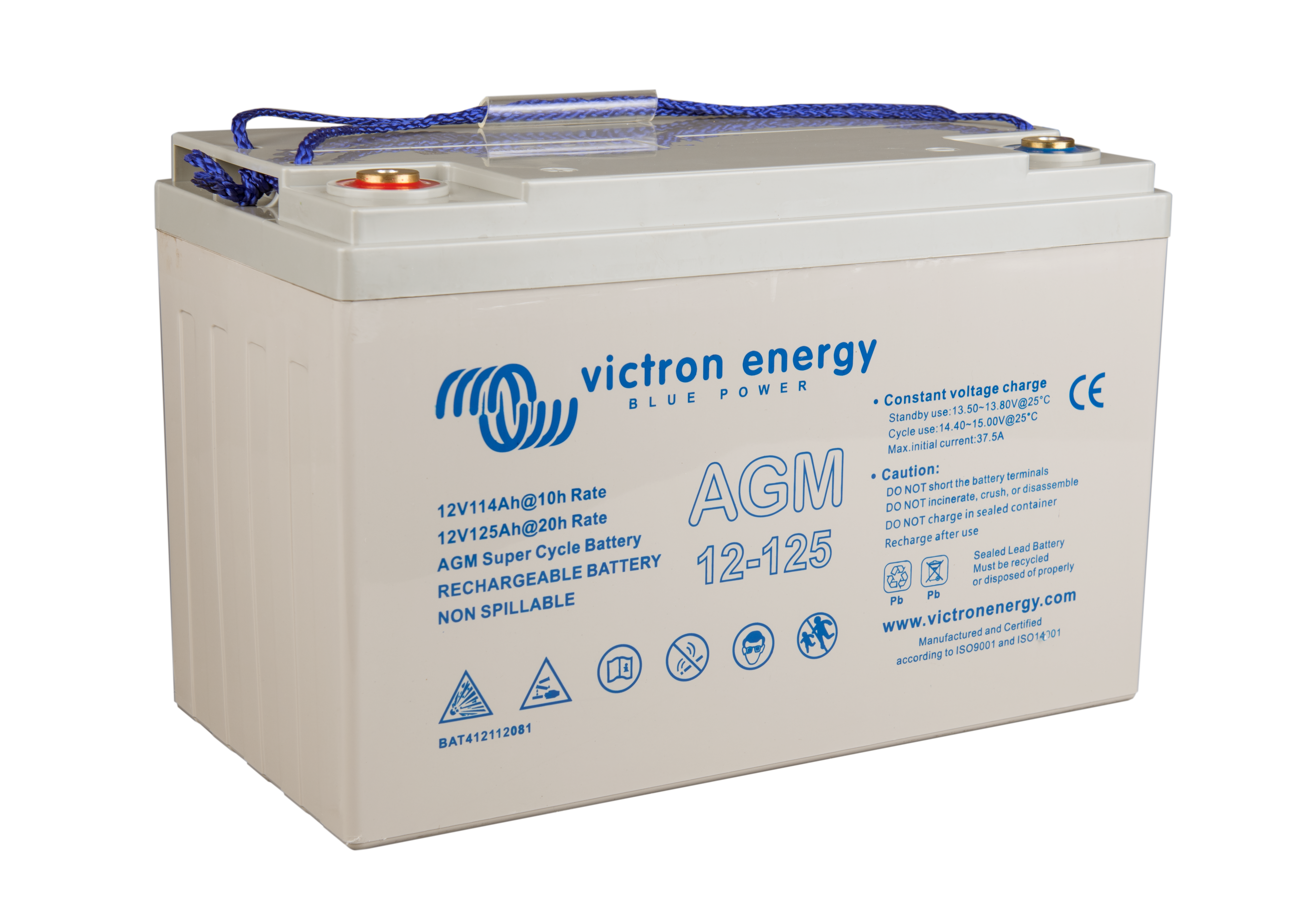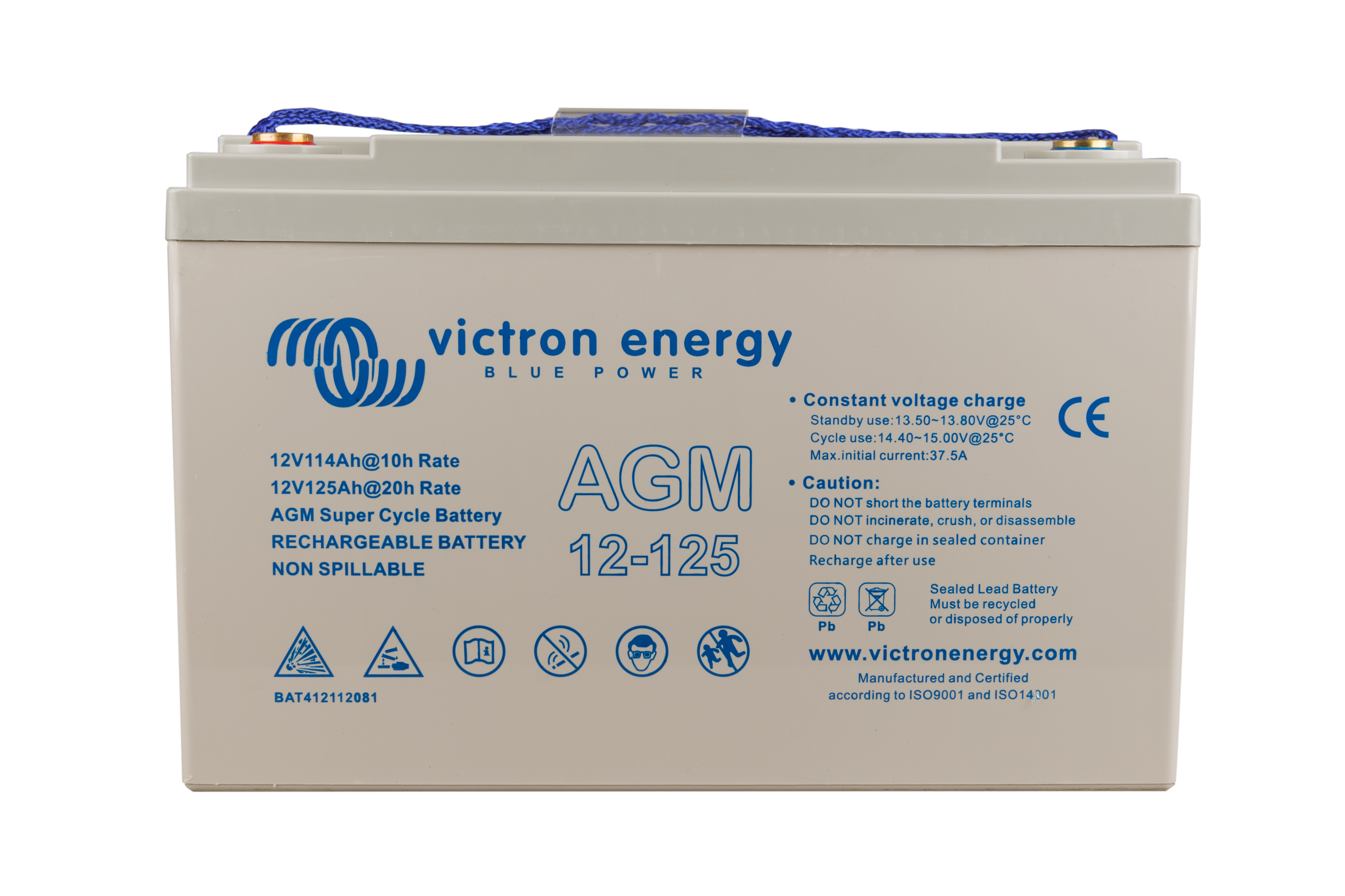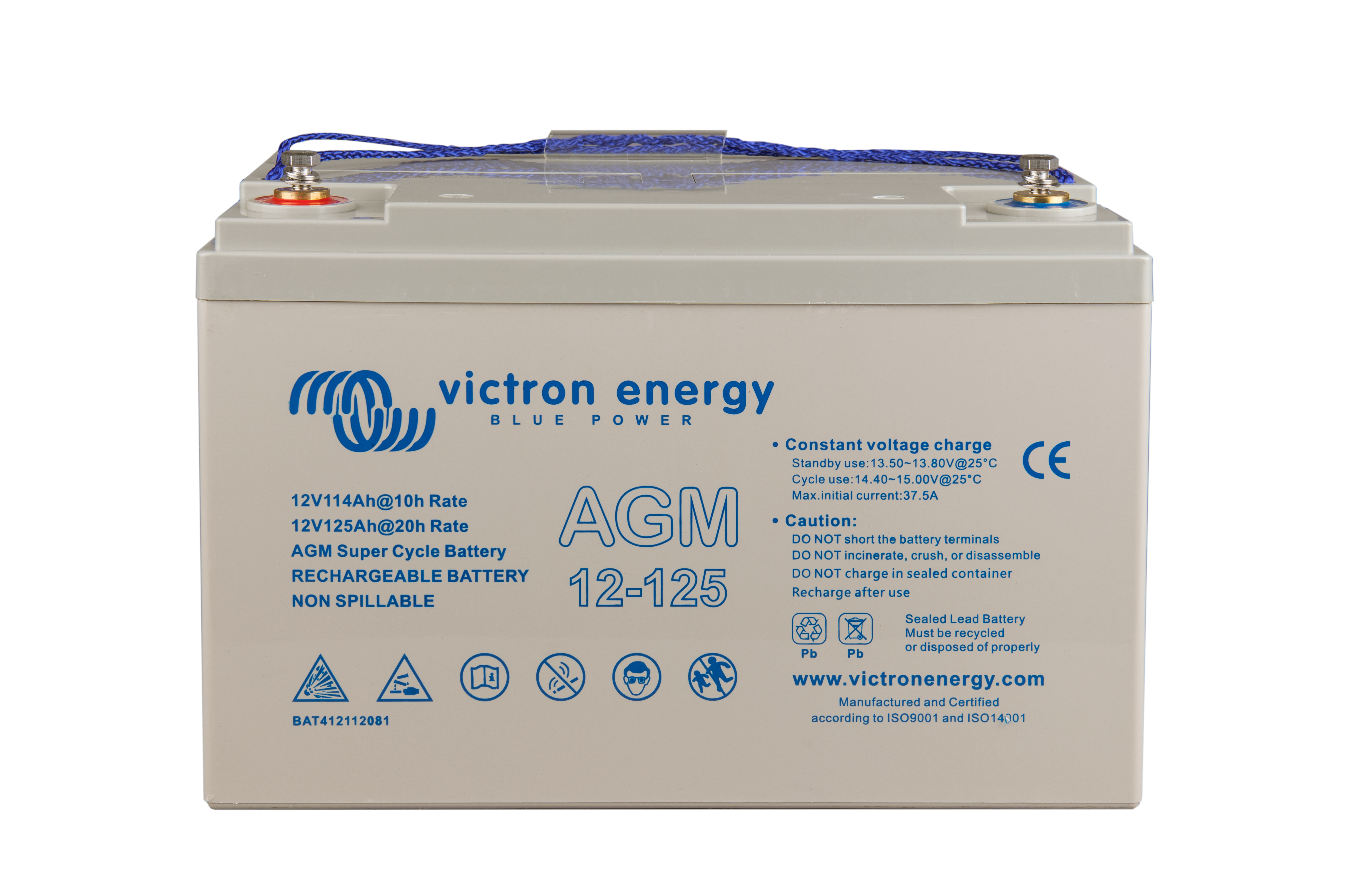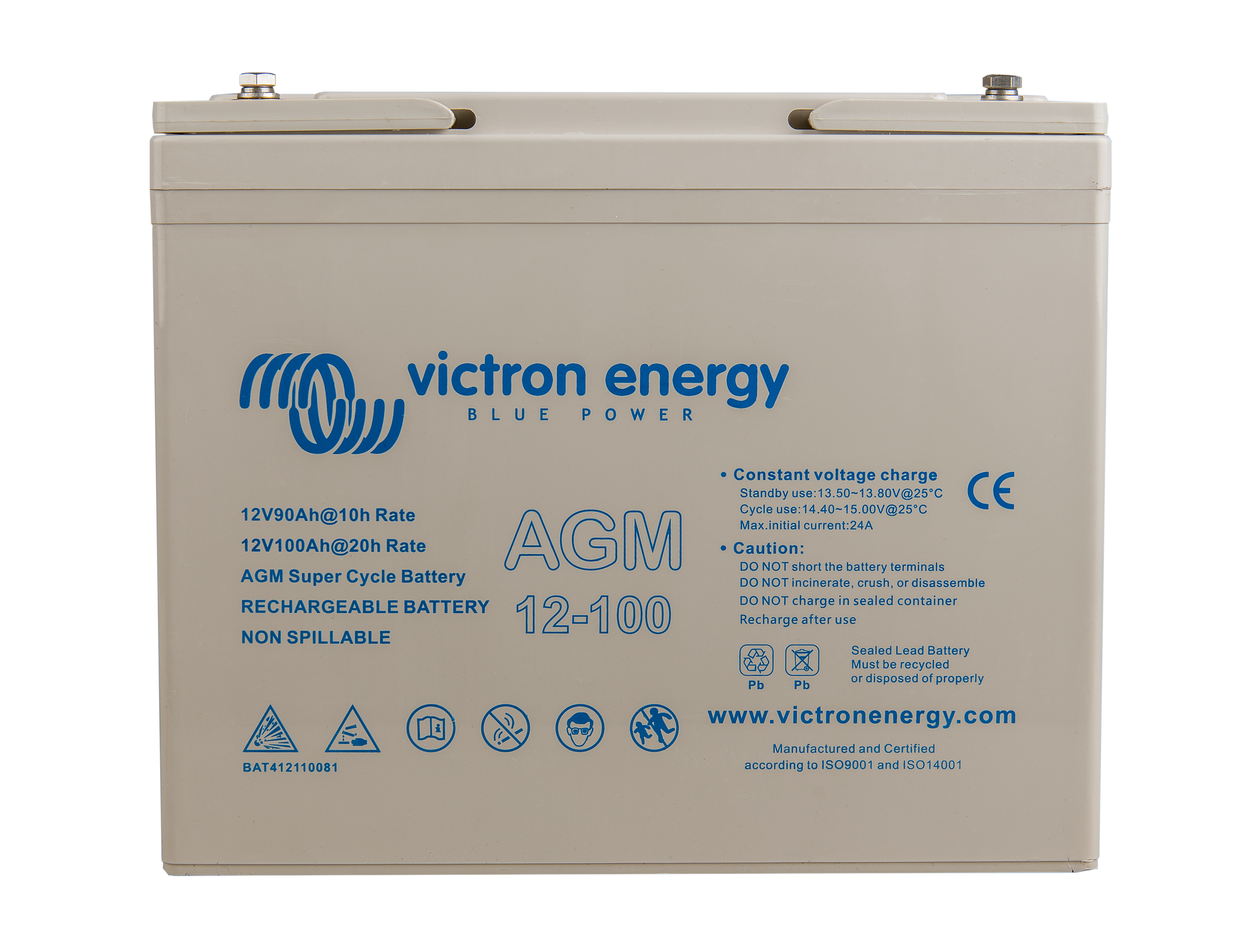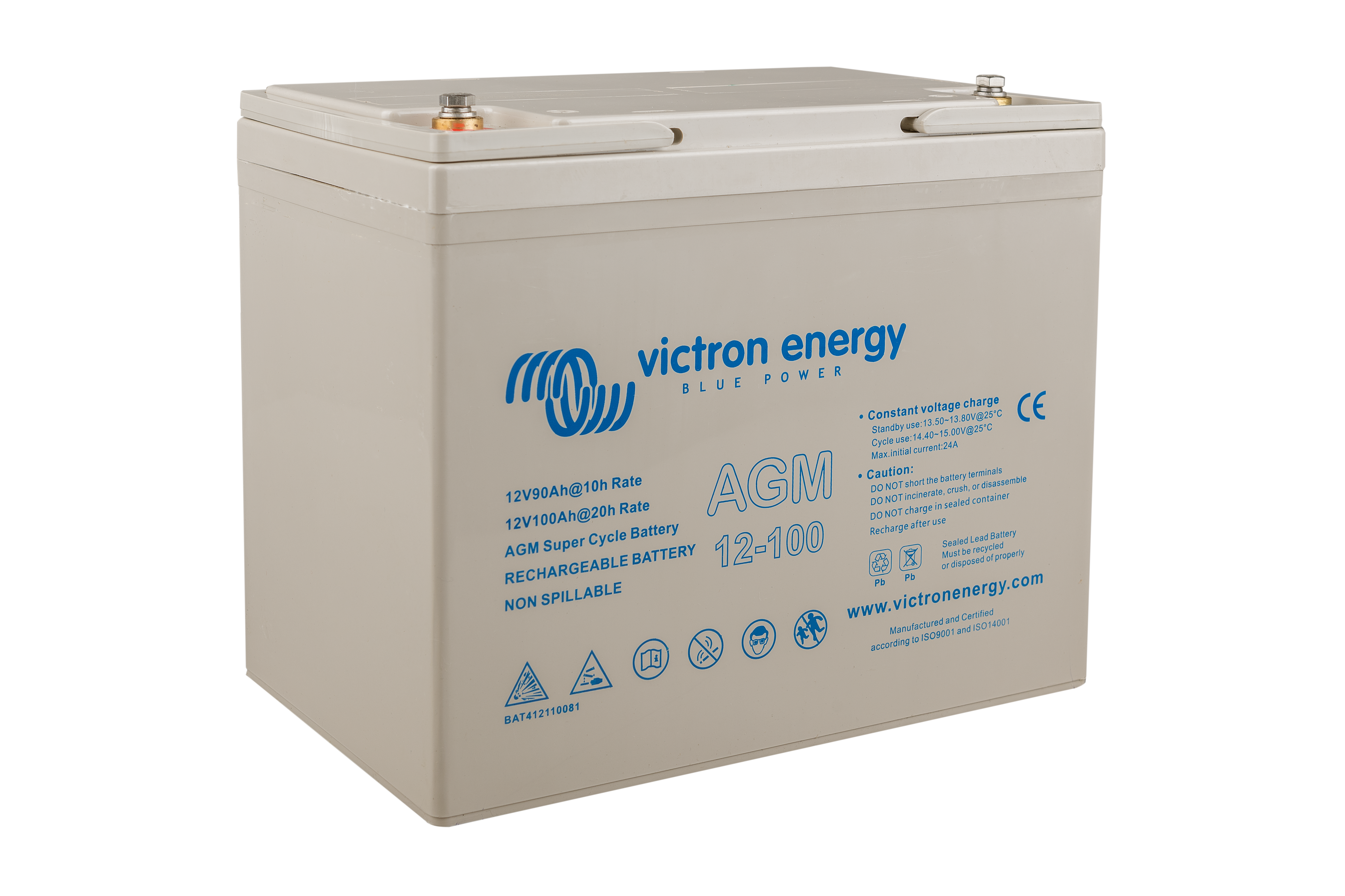 The GEL model range offers best deep cycle durability and overall longer life. The use of high purity materials and lead calcium grids ensure that for both AGM and GEL products have particularly low self-discharge so that they will not go flat during long periods without charge. Both ranges are supplied with M8 drilled, flat copper terminals ensuring best possible connection contact and eliminating the need for battery terminals. The batteries are compliant with both CE and UL specifications in ABS fireproof containers and come with Victron's 2 year world-wide warranty.
