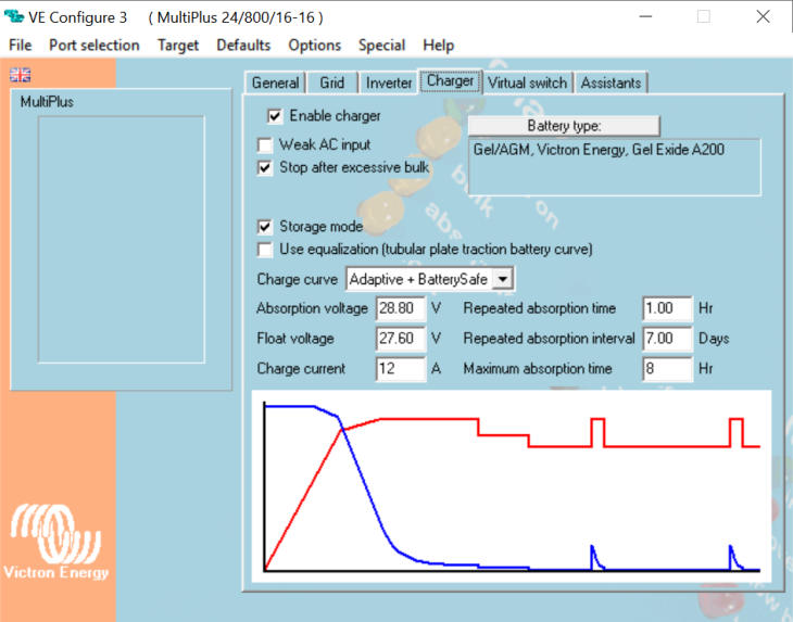 By using VE Power Setup I can login remotely to my Inverter/Charger and get and save the settings. Then by using VE Configure I can locally open the battery charger settings for example by getting the setings using the VE Configuration tools for VE.Bus Products software. I can then change the settings if desired (in this case for a Victron AGM battery storage bank) using VE Configure and send the new settings to the remote site using Remote VEConfigure from within VE Power Setup.