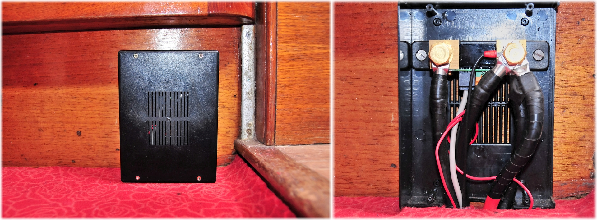 The shunt itself is quite neat but it is necessary to connect battery cables to it so it does require a bit of space. I overcame the problem of where to put it by buying a project box from a well known electronics shop. This allowed me to fit the shunt in a relatively accessible place close to the batteries. As my batteries are mounted under the main cabin floor, positioning the box on the floor under the settee edge, kept the cables and wires clear of errant feet.