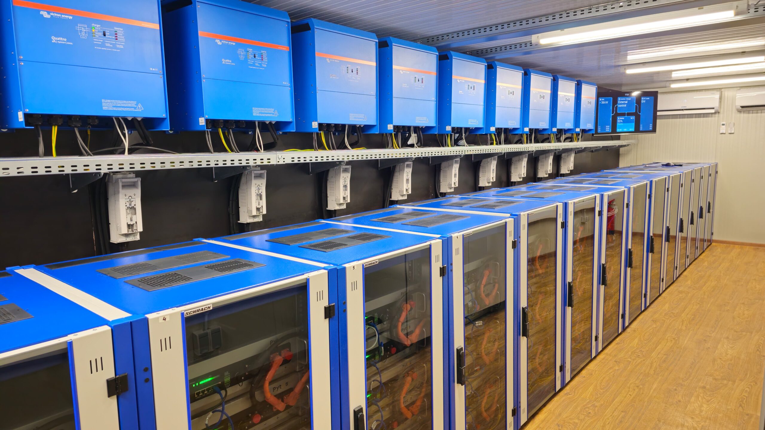 Their energy system employs 12 x Quattro inverter/chargers. Groups of three Quattro’s have been configured for three-phase output. Four sets of three 15 kVA inverter/chargers have been paralleled to provide 144 kW / 180 kVA inverter power and 2400A charging capacity.