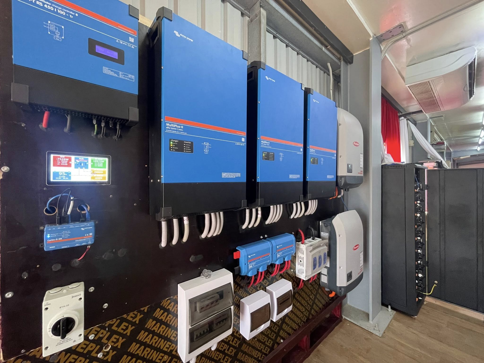 The system comprises an array of solar panels offering 40kWp. An MPPT RS 450/100 solar charge controller harvests the energy and stores it into the battery bank.