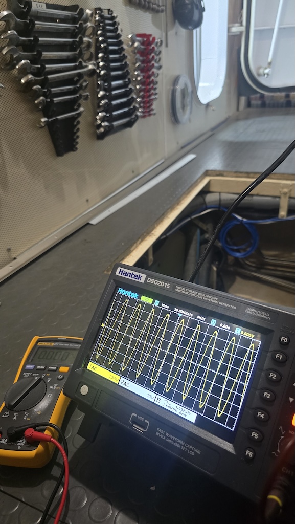 Taking a bird’s eye view, the boat’s power supply had not been designed or installed with an overall unifying vision. Its various parts didn’t work together. Inverter installation was incomplete – there were four 24V 5000VA inverters mounted on the wall, but only two were actually connected, and those hadn’t been correctly configured. Cable lengths were inconsistent, which is a major issue in paralleled inverter systems.