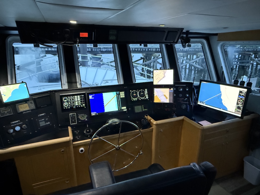 Cowboy is a 74 foot steel-hulled luxury motor vessel with a working-boat pedigree. Built for long-range exploration it’s packed with industrial-grade marine equipment including a Cummins 440hp diesel engine, two power generators, electric steering, and nine tanks holding thousands of gallons of fuel, fresh water, black water – all of which need to be fluid balanced to keep the vessel in trim.