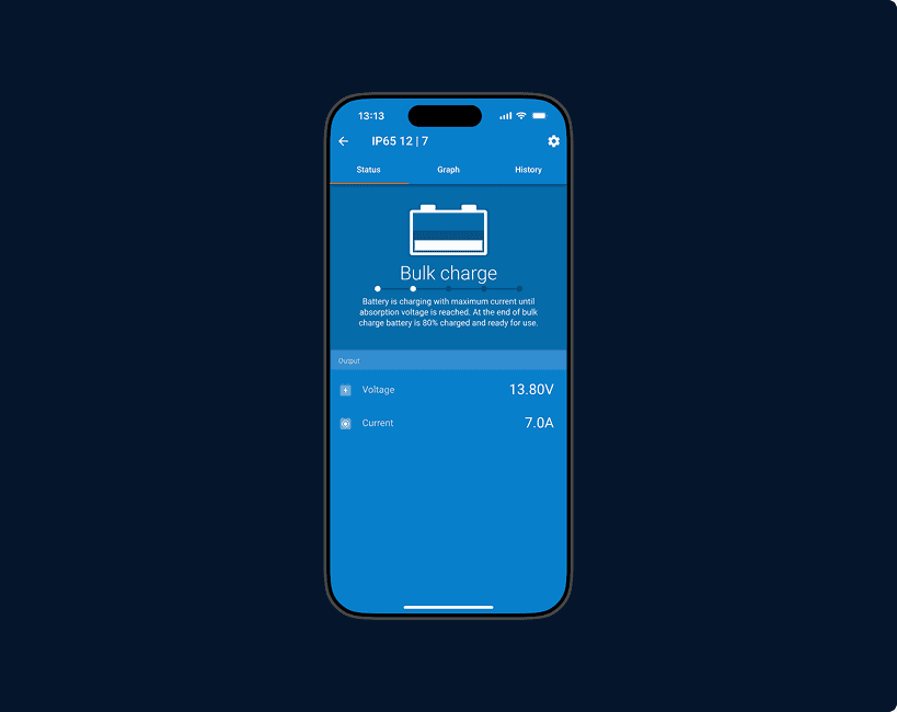 The free VictronConnect app for Android or iOS lets you adjust charging profiles, track real-time status, and view usage history, so you can stay in charge without touching the charger.