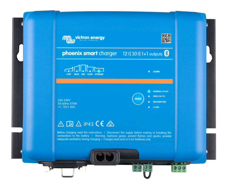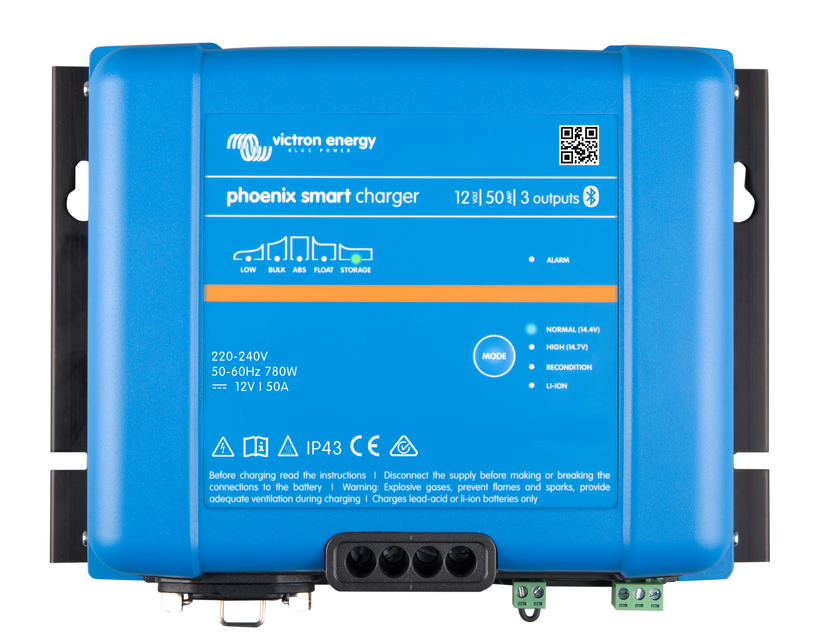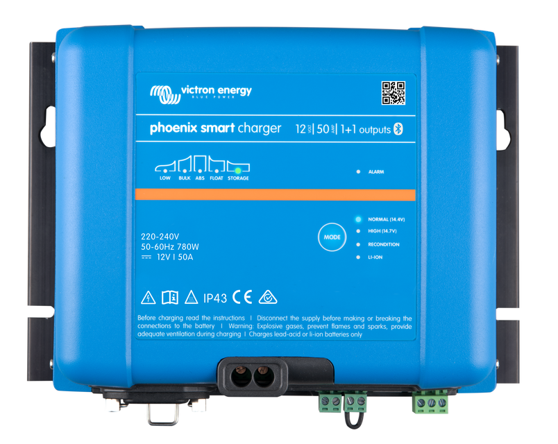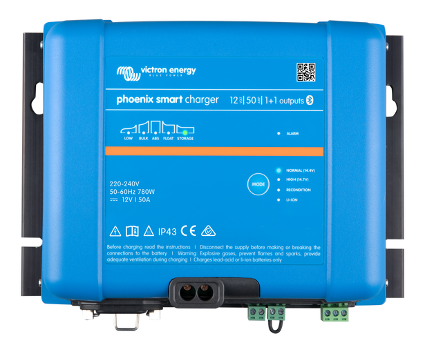 With boat owners in mind this adaptive 5-step charger can provide either 30A or 50A of charge to each of three battery banks. Or the Phoenix 1+1 model provides 3A to the starter-battery, the rest to the ‘house’ bank. 24V models are available with 16A/25A charge. Bluetooth enabled, you can monitor the charger and set alarms straight from your phone. Adaptive, intelligent, dynamic charge features – see the datasheet below.