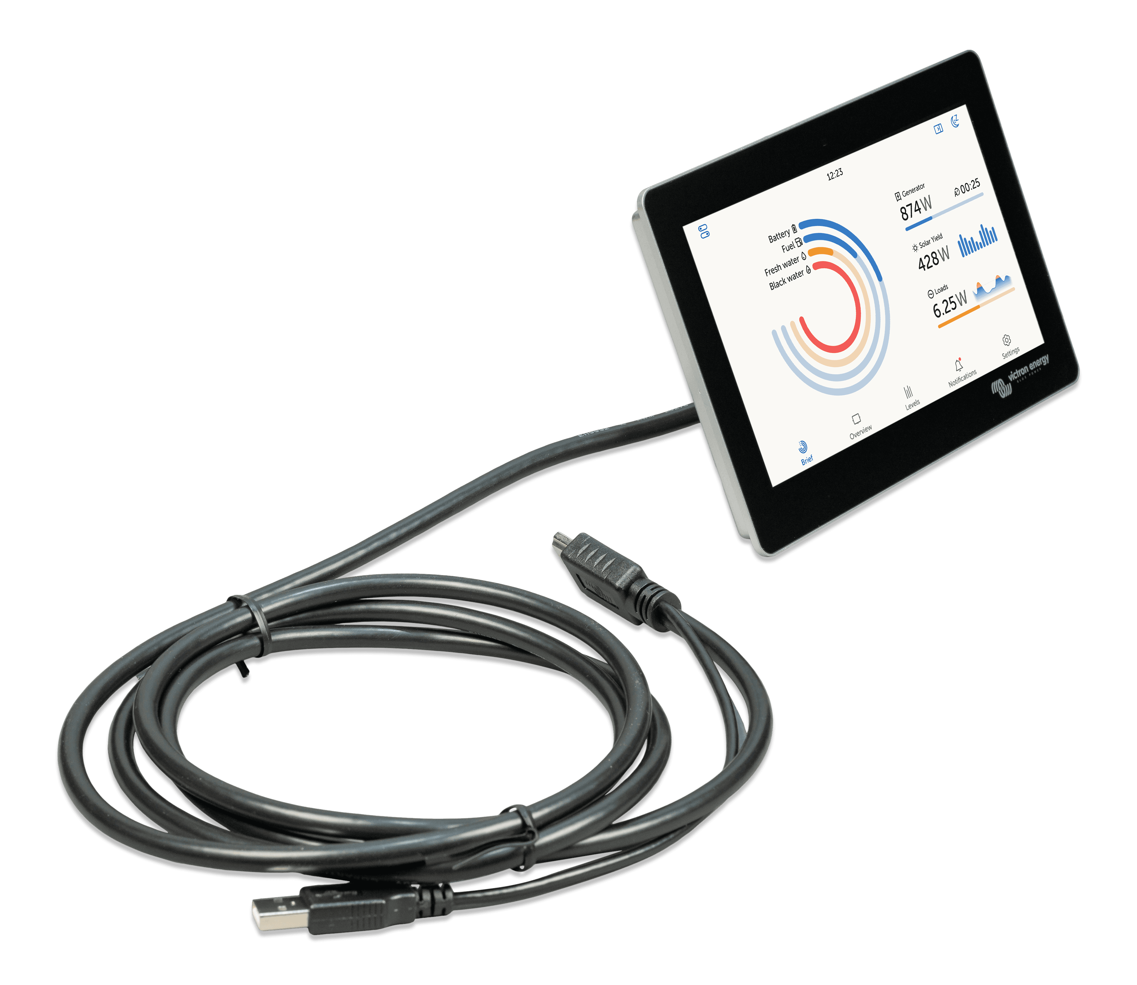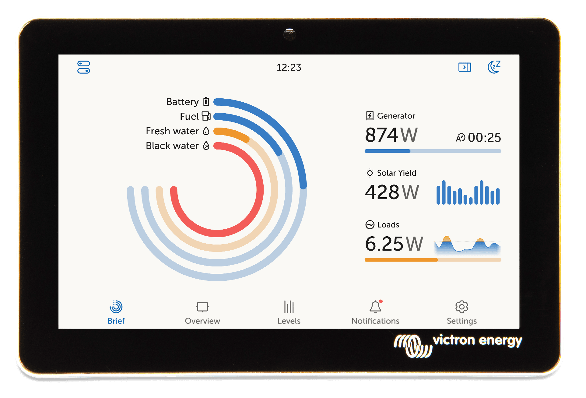 The GX Touch 50 and GX Touch 70 are display accessories for our Cerbo GX. The five inch and seven inch touch screen displays give an instant overview of your system and allow to adjust settings in the blink of an eye. Simply connected to the Cerbo GX with one cable, Their super slim waterproof design, top-mountable setup and simple installation bring a lot of flexibility when creating a crisp and clean dashboard.