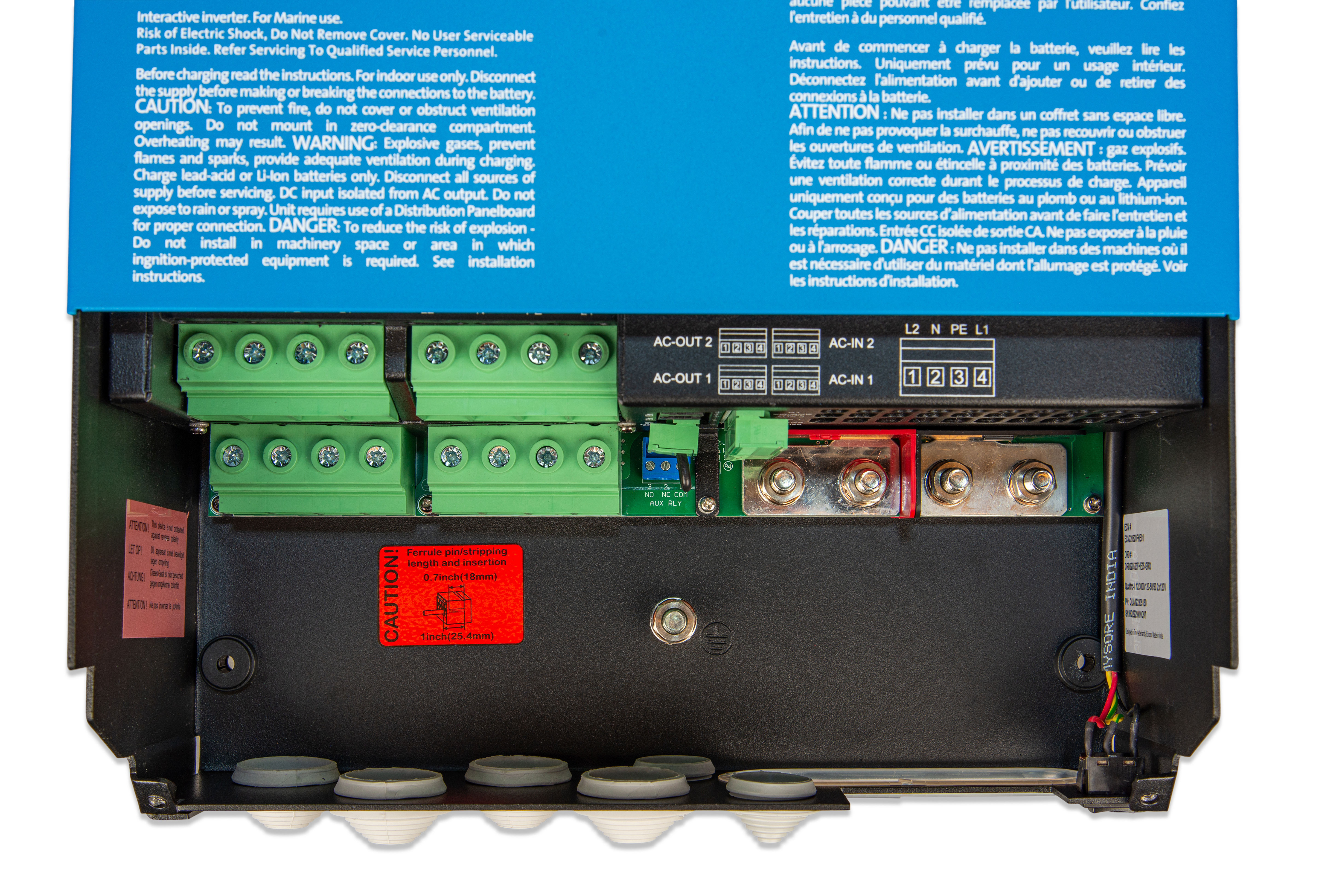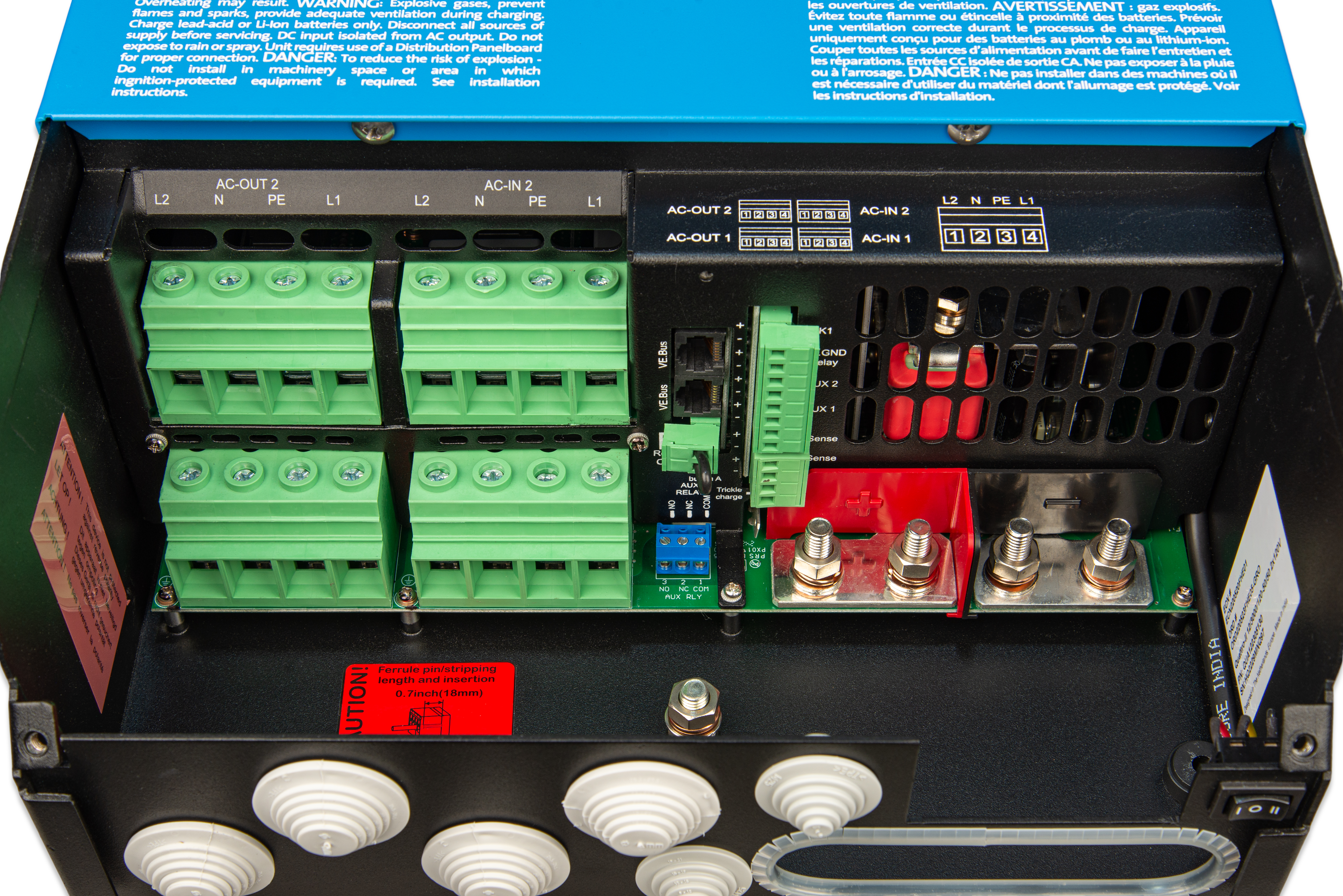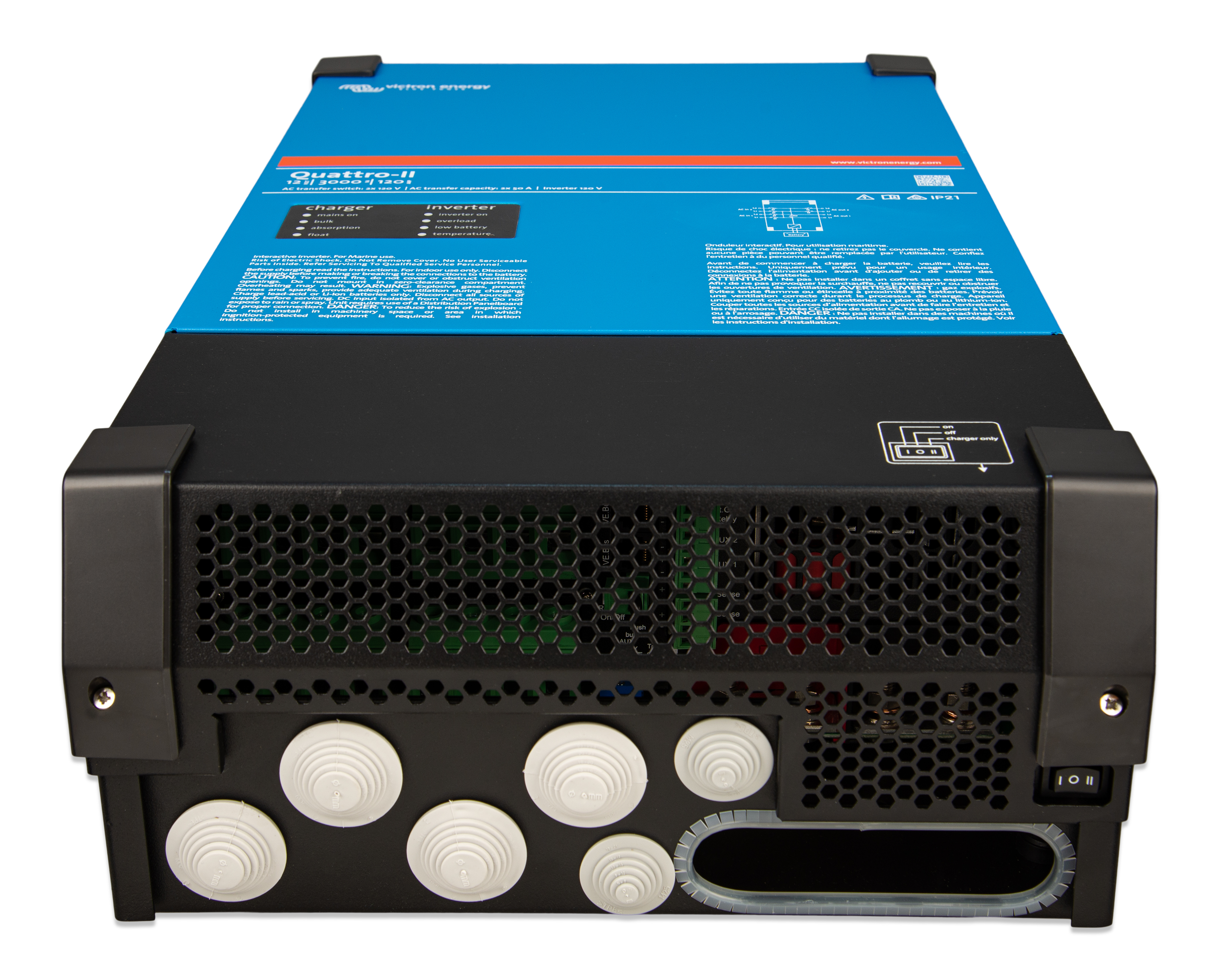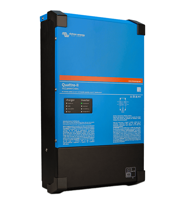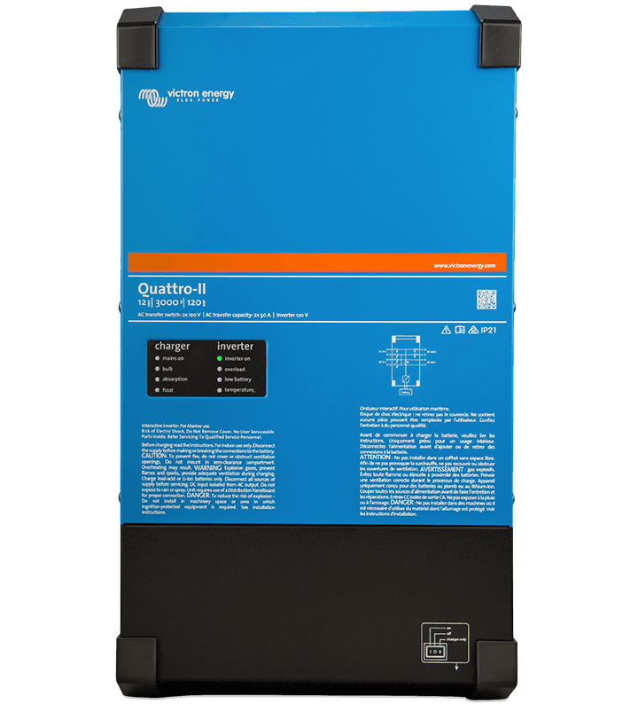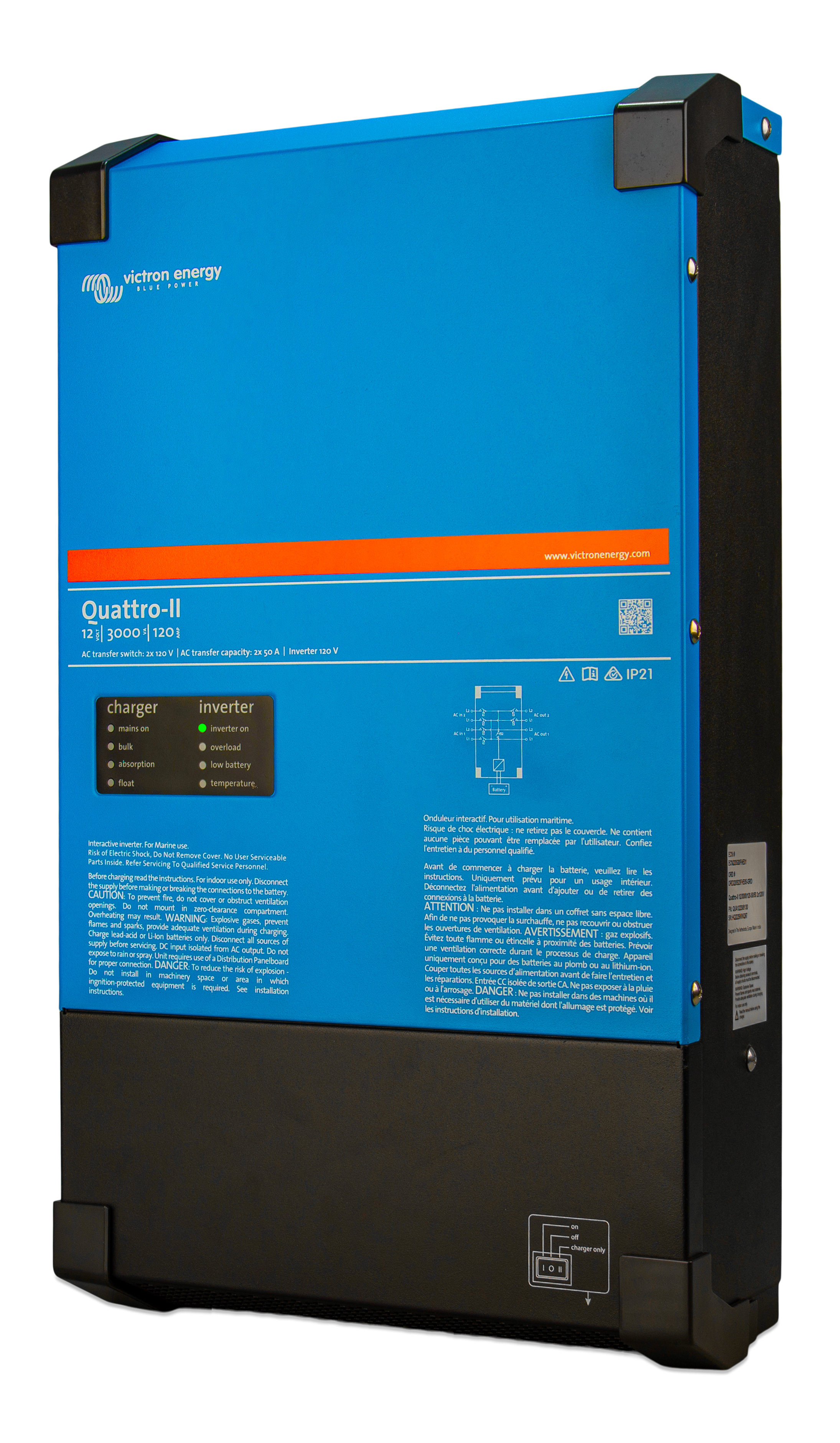 The Quattro-II 2x 120V has all of the expected features of our versatile inverter/charger range, including PowerControl, PowerAssist, Input Current Limit, two AC outputs, as well as parallel and 3-phase configuration for larger capacity VE.Bus systems. Suitable for LiFePO4 batteries and a variety of other battery technologies.
