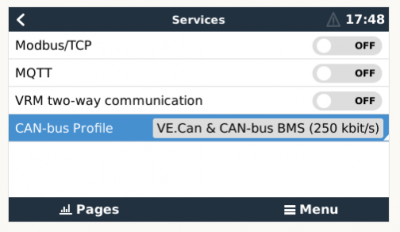 In case a setting does need changing, such as setting a different baud rate or configuring a VE.Can port to be used for BMS-Can instead, use the menu path Settings → Services → CAN-profile.