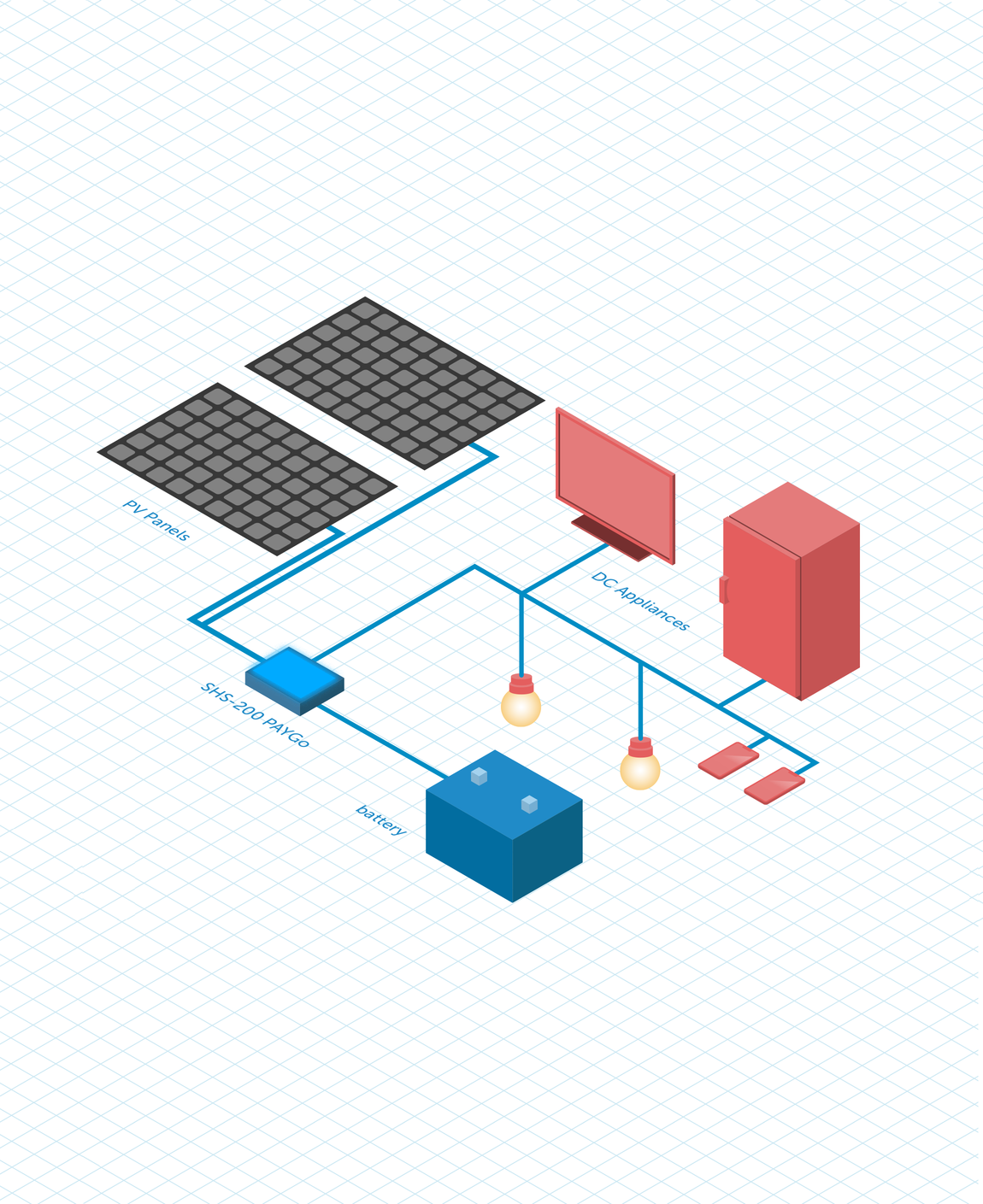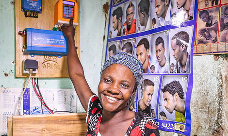 Solar home systems enable end-users to climb the energy ladder and enjoy a variety of household appliances such as TVs, fridges or sound systems. This solution is also powerful enough for entrepreneurial customers to run a small business or productive machinery, using an inverter to provide AC power.