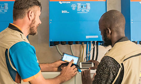 A mini-grid provides access to electricity for entire villages, an hospital or even a small factory. Solutions include an off-grid solar field, distribution network, MPPT solar chargers and/or PV inverters, inverter-chargers and a battery bank, combined with hybrid generator setups where needed and can be easily expanded when demand is rising.