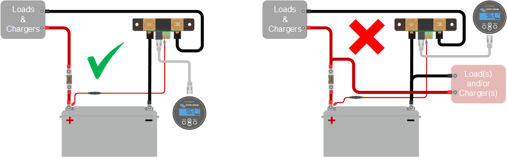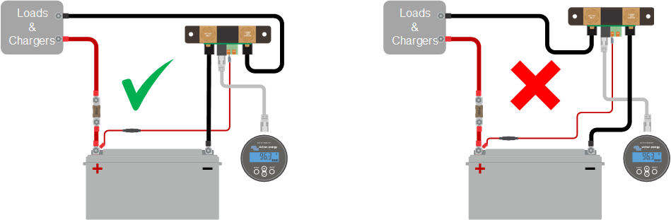Om den negativa polen på en belastning eller en laddningskälla kopplas direkt till den negativa batteriterminalen eller till batteriminussidan på shunten kommer inte strömmen från dessa att flyta genom batteriövervakaren och kommer inte tas med i strömavläsningen och därmed inte heller i avläsningen för laddningsstatus.