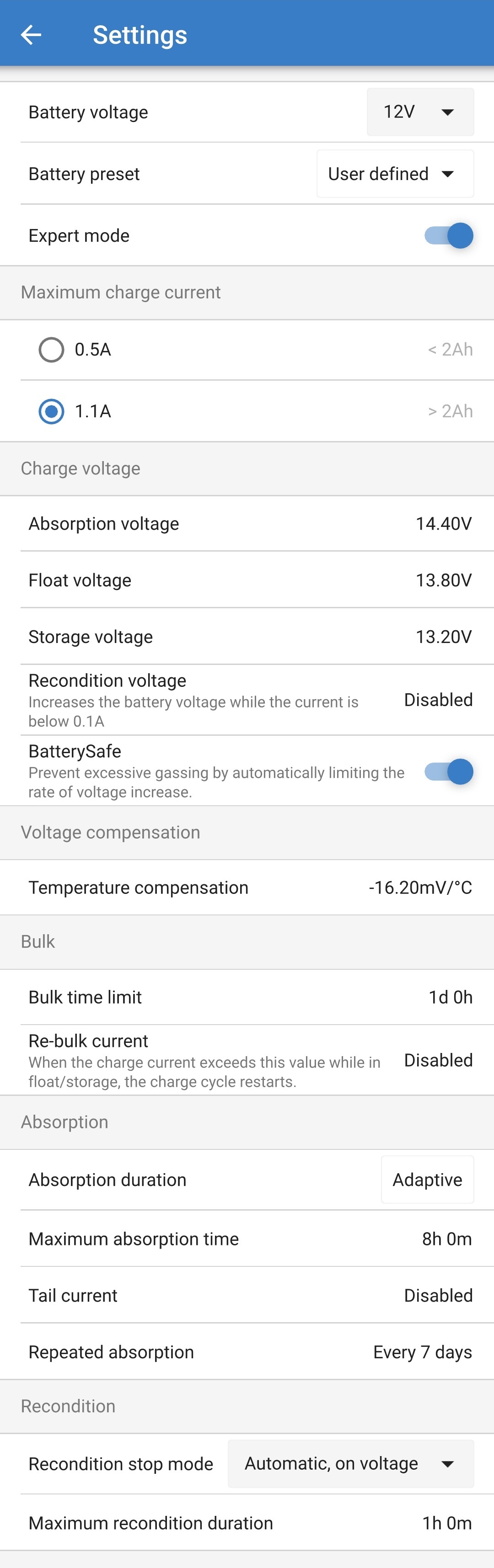 Para as baterias mais comuns, a configuração avançada não é necessária nem recomendada; os modos de carga integrados e a lógica de carga adaptativa são normalmente adequados e funcionam muito bem.