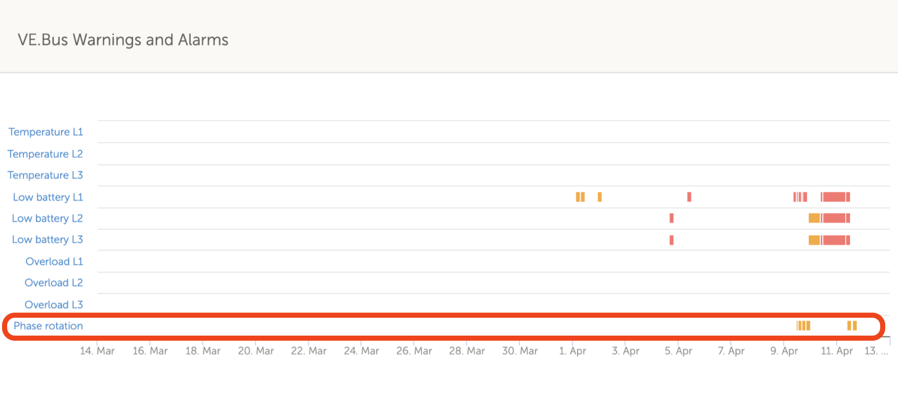 No dispositivo GX, a advertência surge como uma notificação no GUI. Também é visível no menu de dispositivo de inversor / carregador. No Portal VRM, o aviso aparece no widget de Alarmes e Avisos VE.Bus na página Avançado e vai ser listado no registo de alarmes. Também é enviado um correio eletrónico através do sistema de Monitorização de Alarme VRM. | ![]() |