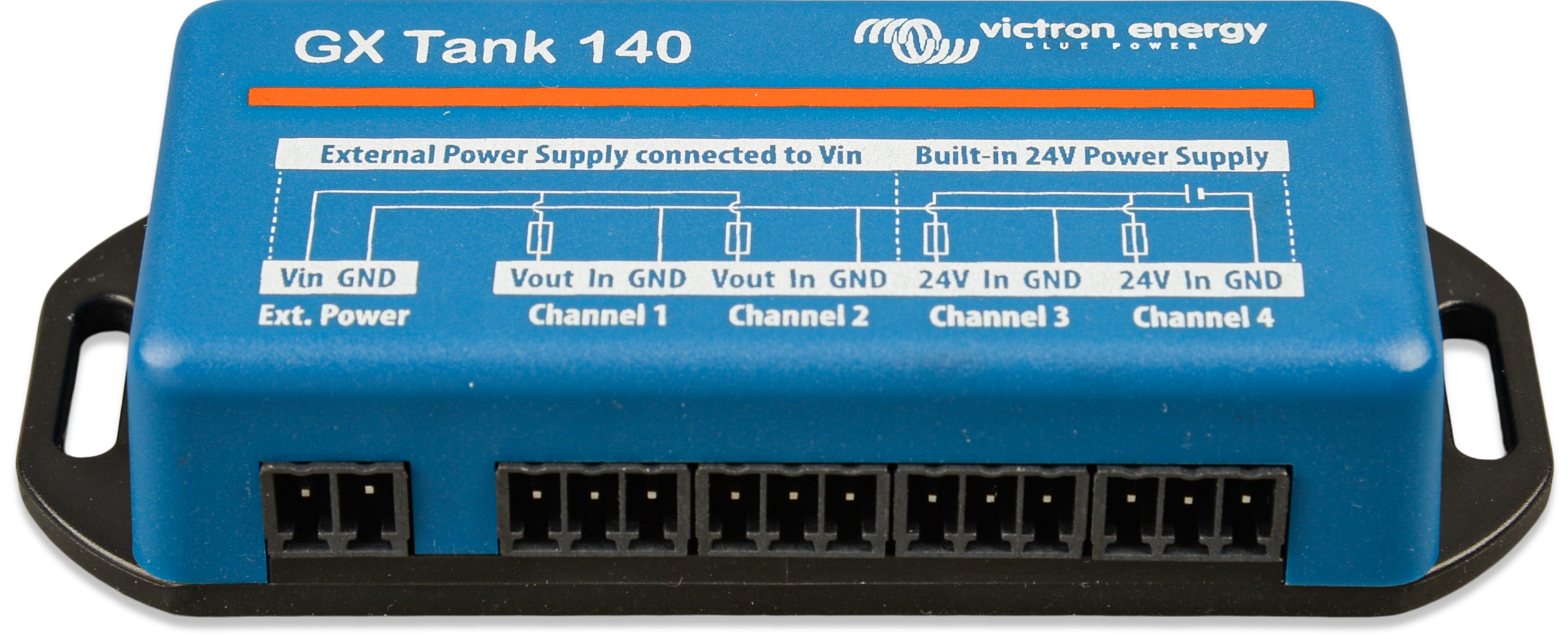 The GX Tank 140 is an accessory for the Victron GX range of system monitoring products. It supports up to four tank-level sensors, with readings visible locally on the GX device and remotely via the VRM Portal.