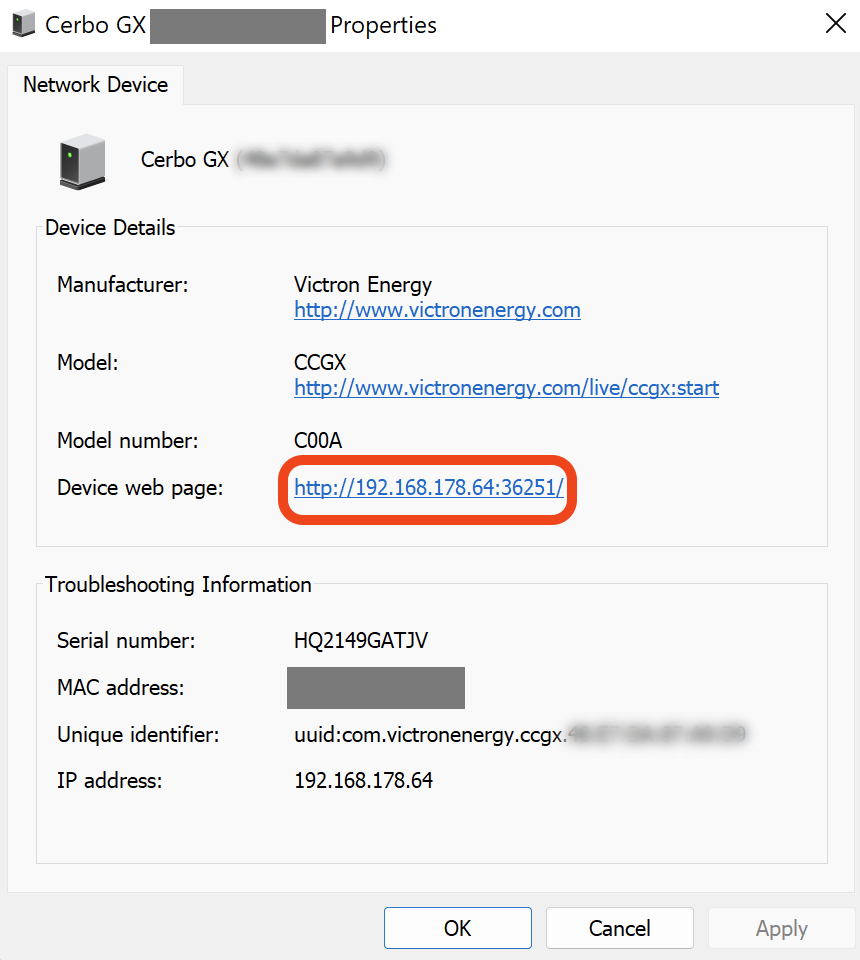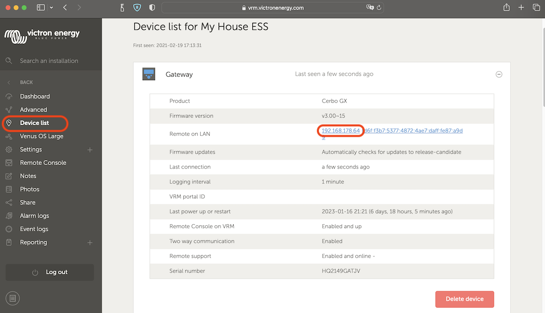 Om GX-enheten är ansluten till internet och registrerad i VRM-portalen kan du hitta dess IP-adress: