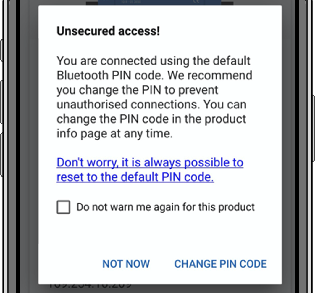 Om din enhet använder standardkoden kommer du ombes att ändra den till en mer säker unik kod. Se till att spara din nya pinkod på ett säkert ställe.