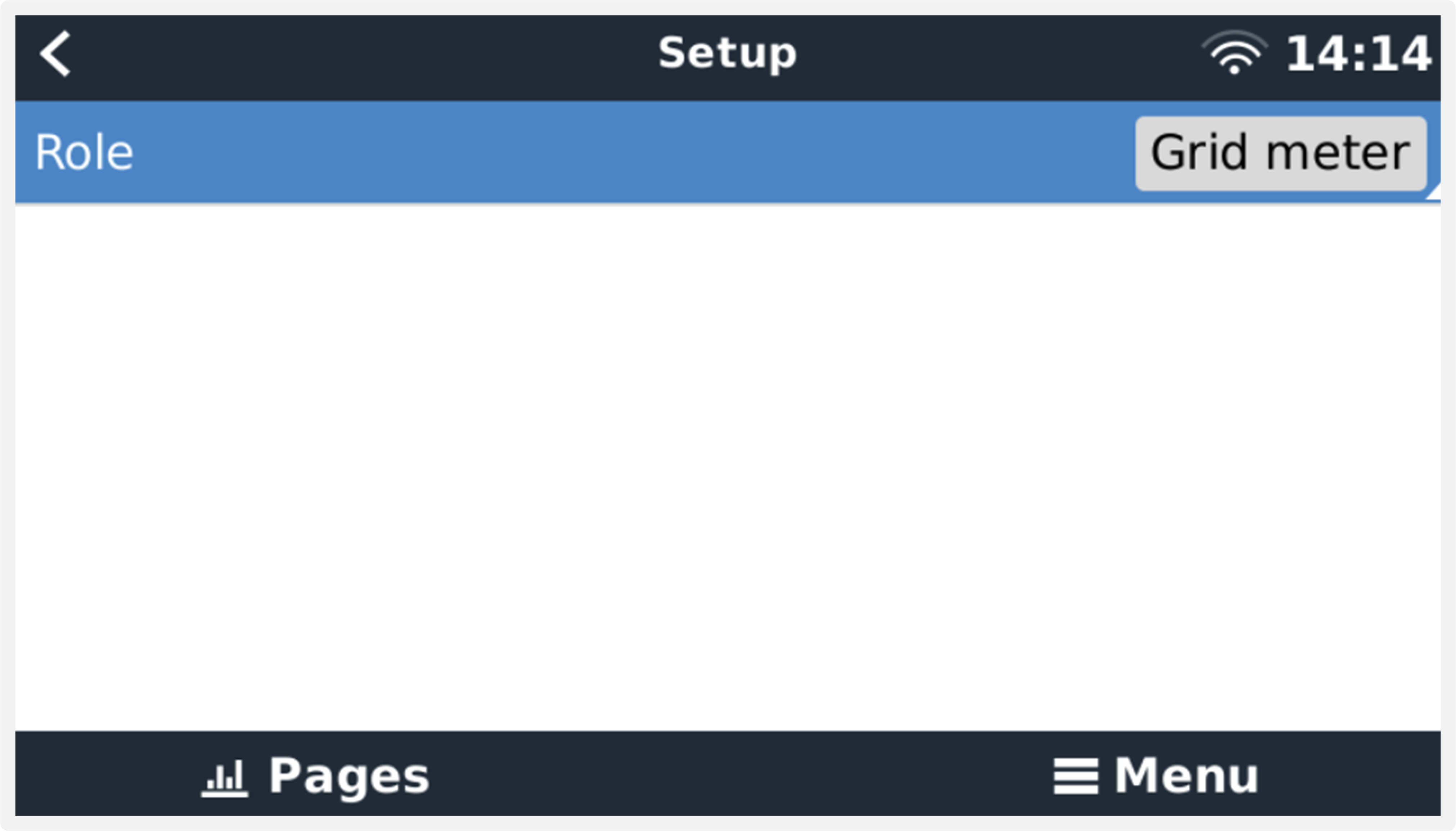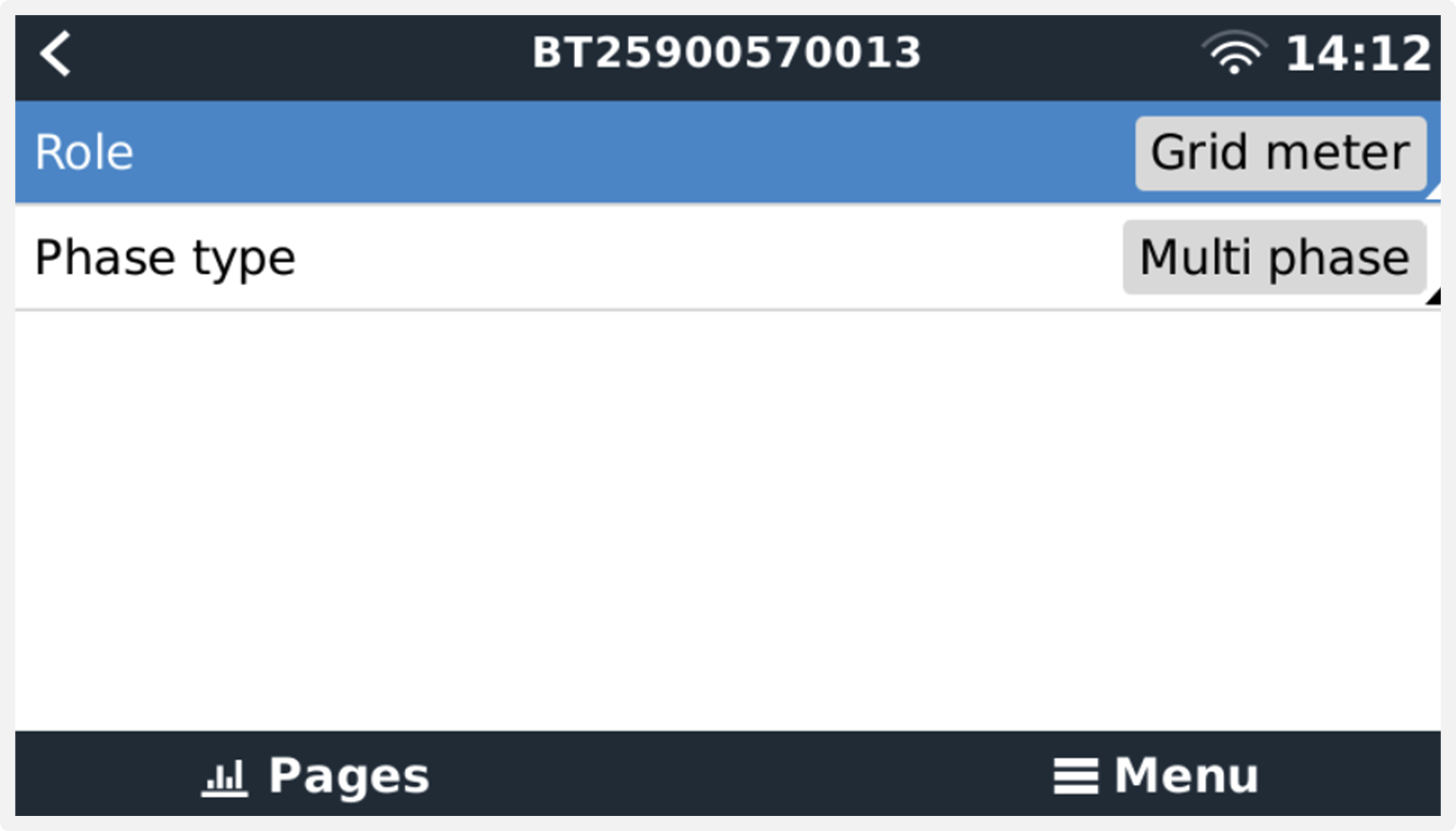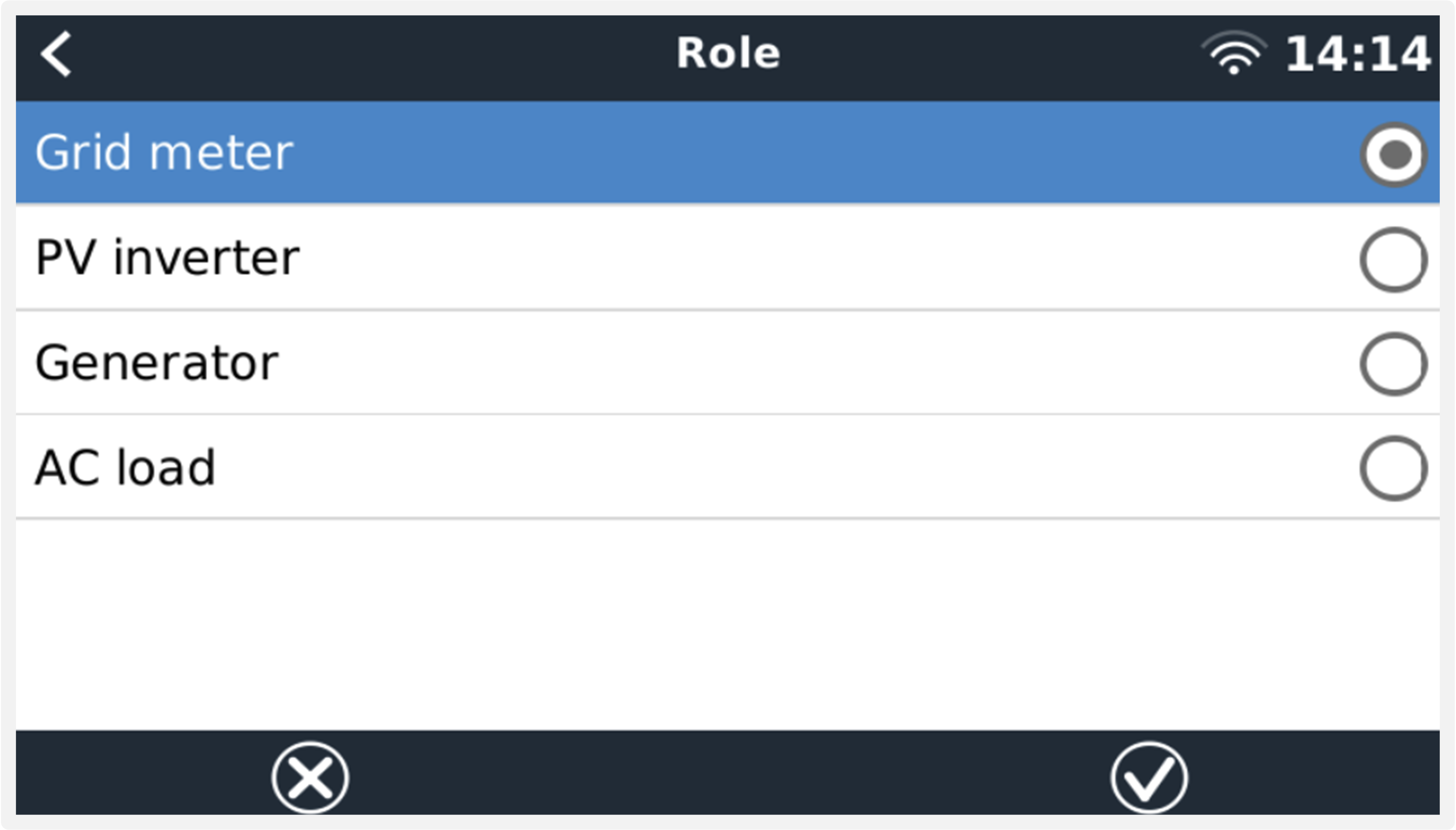 The configuration option of either Grid Meter, PV Inverter, Generator or AC Meter is set in the GX device. For details on GX device configuration see the GX device configuration chapter. This selection will affect how the system should be wired and how the information received from the meter is displayed on the screen.