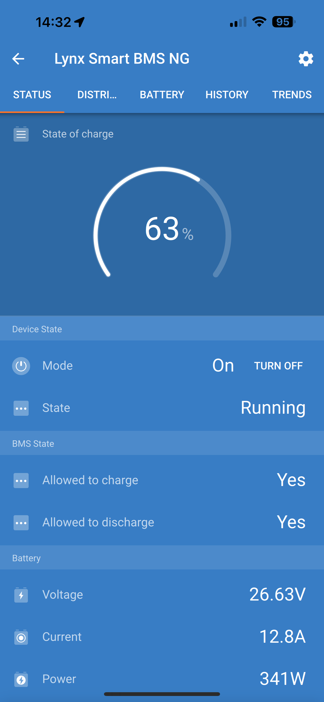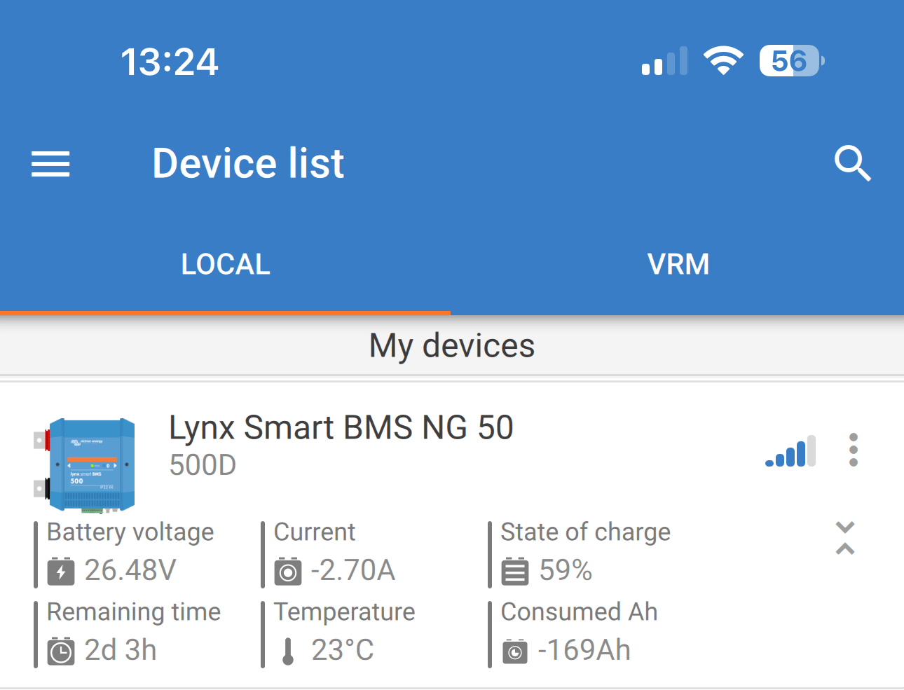 Sull'app VictronConnect tramite VictronConnect Remote (VC-R): Ciò richiede che un dispositivo GX sia collegato a un Lynx Smart BMS NG e che i dati siano trasmessi al portale VRM.
