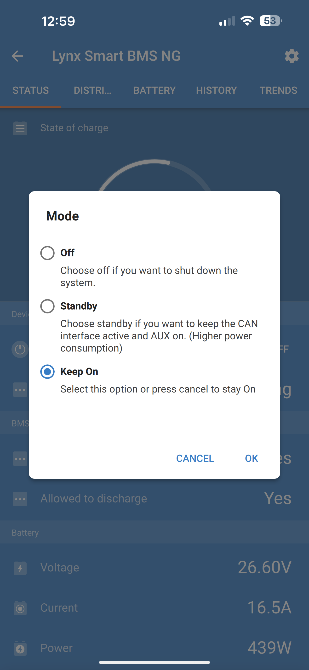 Il Lynx Smart BMS NG può passare alla modalità Standby tramite l'interruttore soft nell'app VictronConnect o tramite il dispositivo GX e tale modalità si utilizza quando l'imbarcazione è ormeggiata o il camper è parcheggiato per evitare scariche e cariche accidentali da sorgenti sul lato sistema. Tutti i sistemi saranno spenti, ad eccezione delle apparecchiature alimentate dalla porta di alimentazione AUX, tramite la quale si consiglia di alimentare il dispositivo GX. Questa modalità non è destinata a essere utilizzata quando l'imbarcazione o il camper sono in rimessaggio per un periodo prolungato. Di conseguenza, quando viene rilevata una bassa tensione delle celle o un basso SoC (come determinato dall'impostazione della soglia di scarica nel BMS), il Lynx Smart BMS NG passa automaticamente alla modalità OFF per evitare un'ulteriore scarica della batteria.