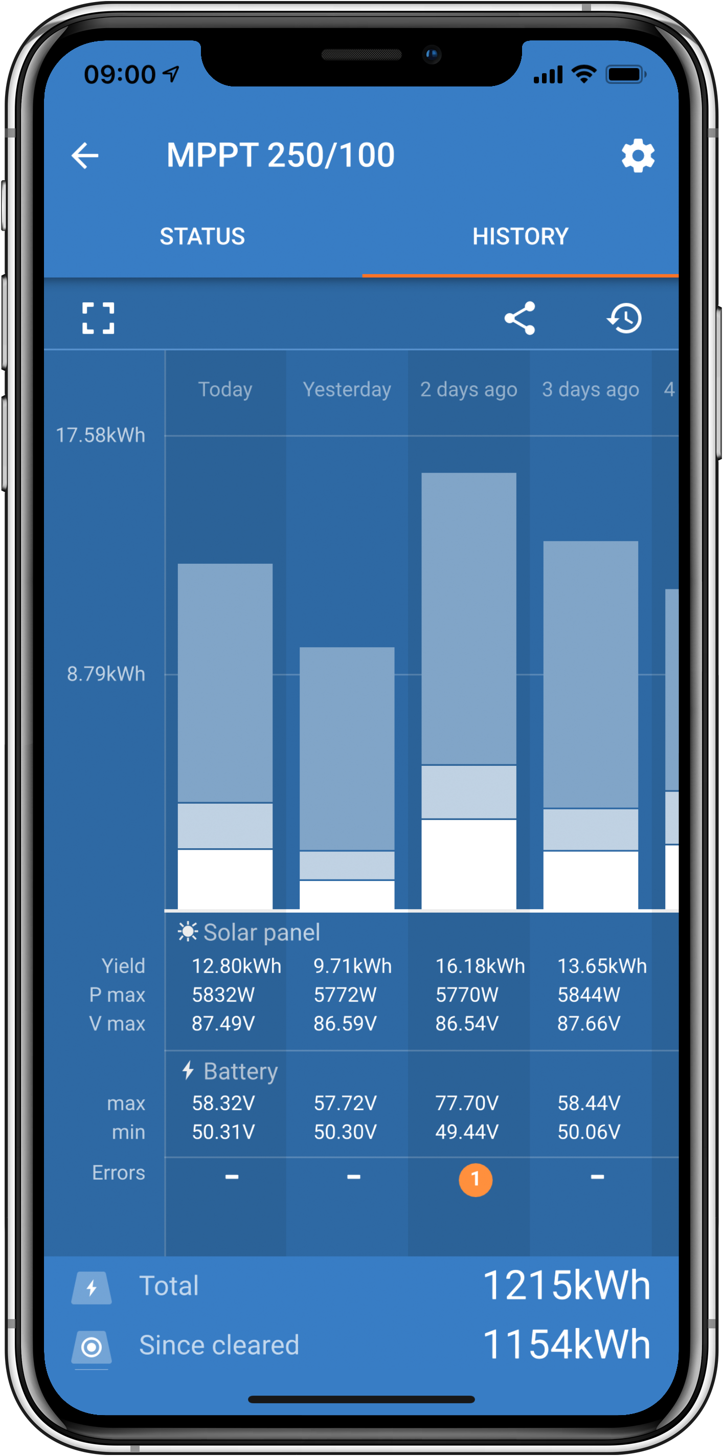 L’application VictronConnect affiche également les erreurs historiques. Pour voir ces erreurs, accédez à l’onglet « Historique » et regardez en bas de chaque colonne journalière. Un point orange indique qu’une erreur s’est produite ce jour-là.