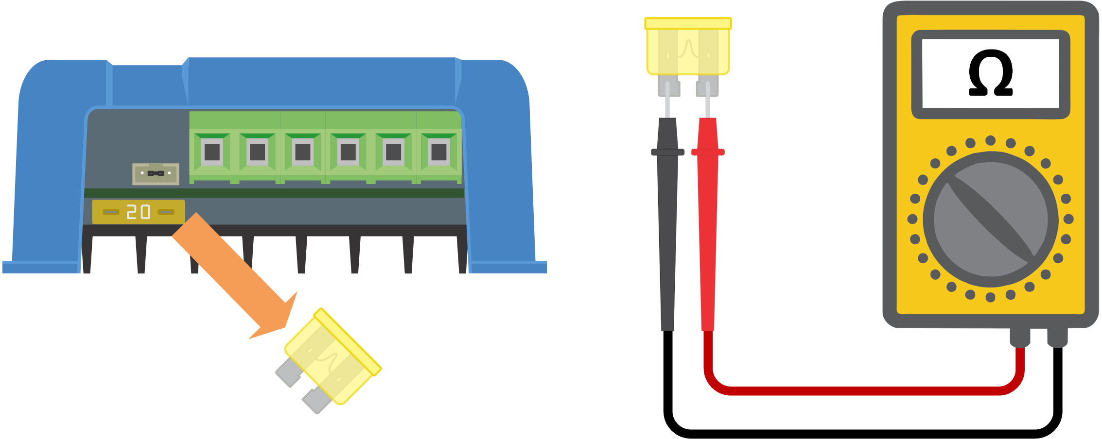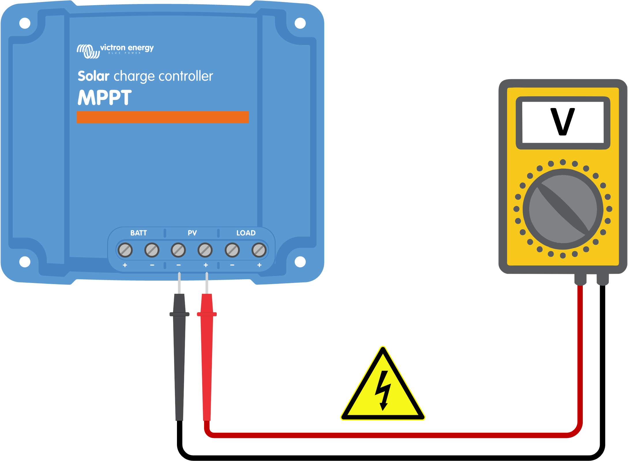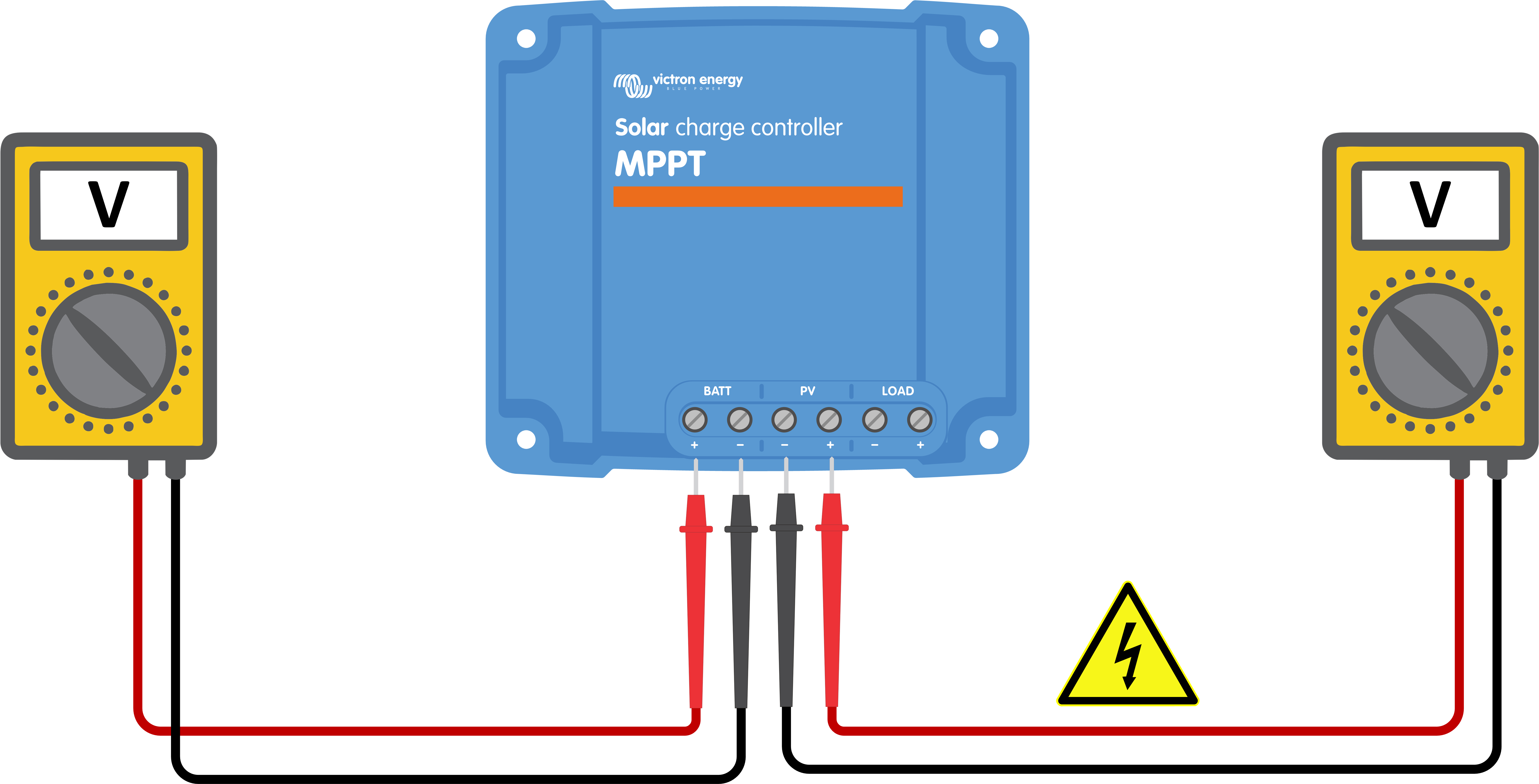 Phase 2 | Si l’étape ci-dessus s’avère impossible, utilisez un multimètre en mode CC pour mesurer la tension de la batterie et la tension PV aux bornes du chargeur solaire.