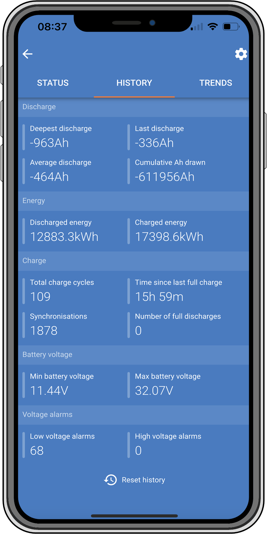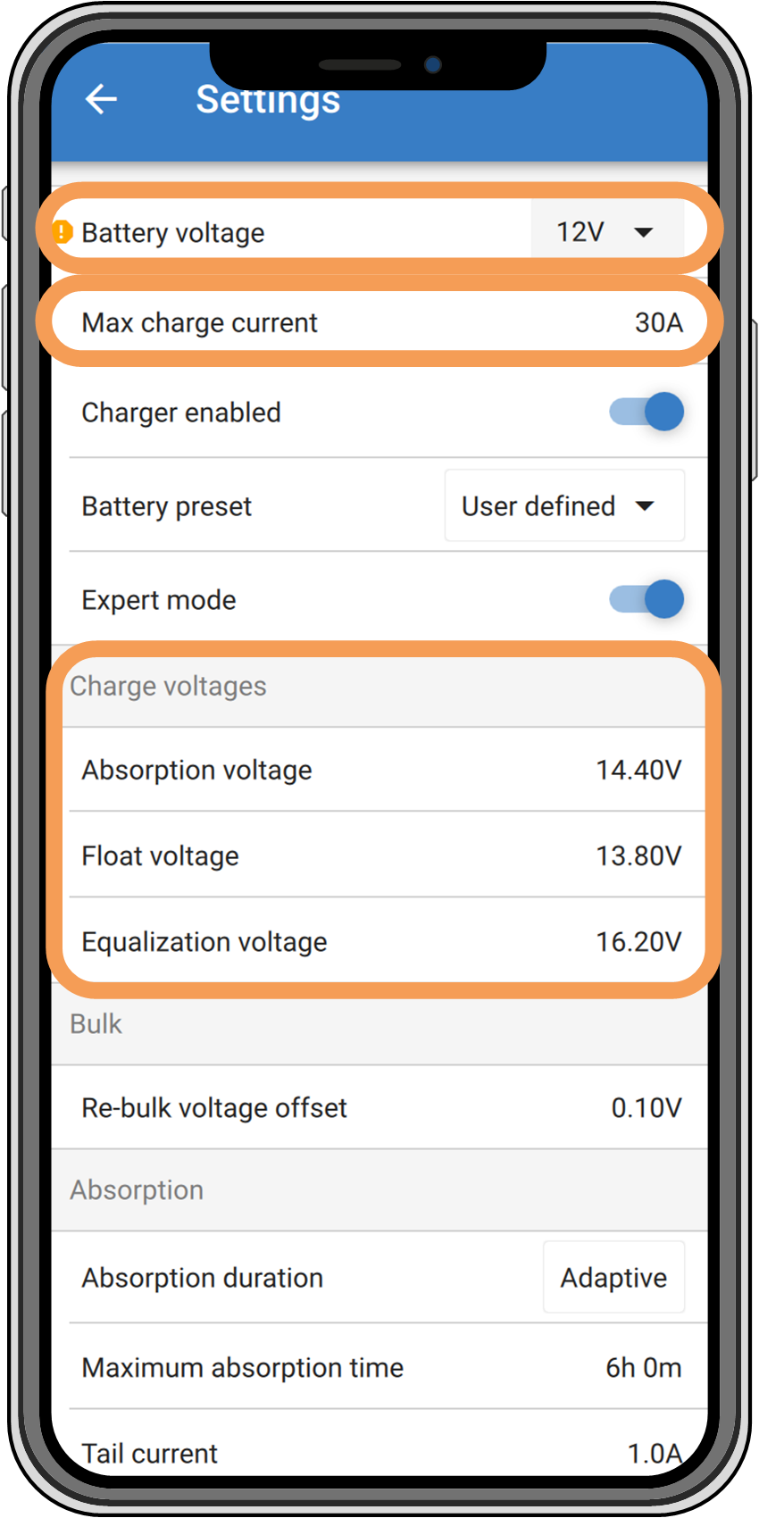 Pour confirmer les tensions de batterie compatibles, reportez-vous au chapitre Spécifications techniques ou consultez le menu déroulant du paramètre « tension de batterie » " dans l’application VictronConnect.