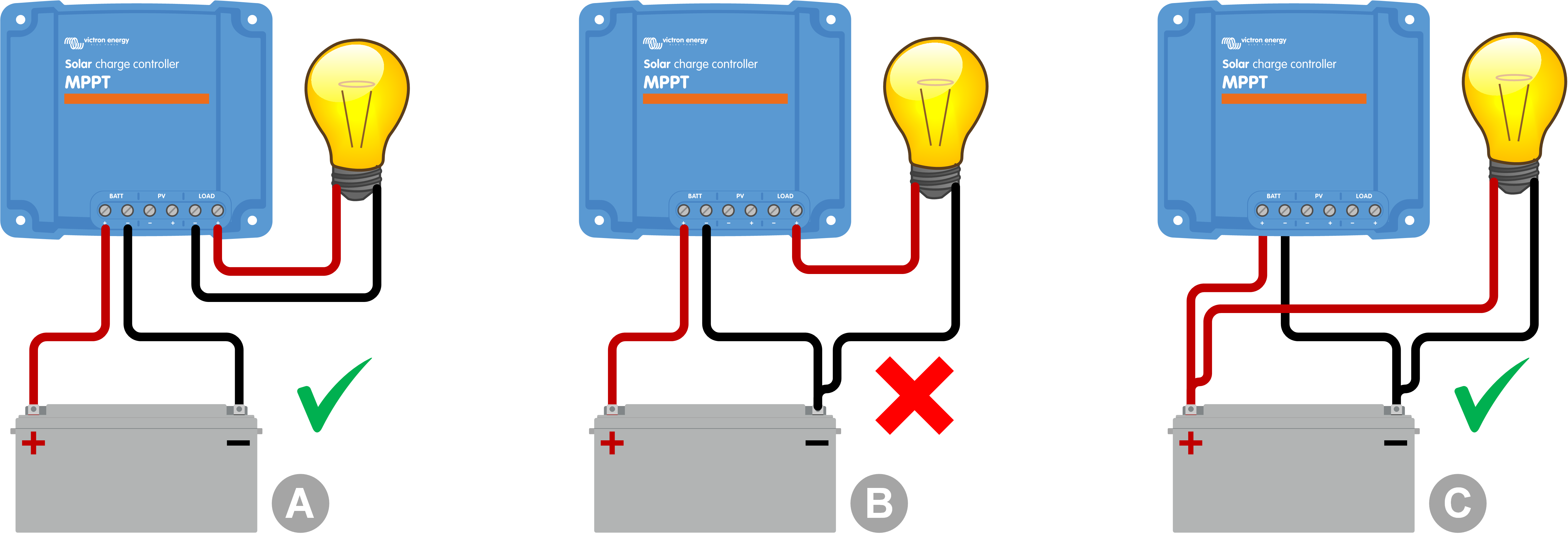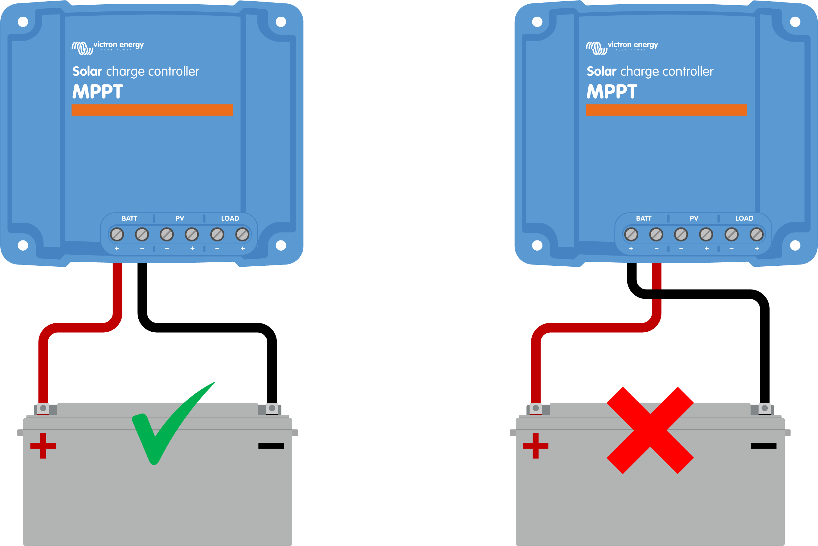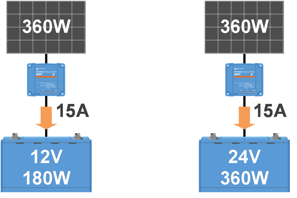 Évitez d’utiliser le chargeur solaire comme chargeur CC-CC (par exemple, pour charger une batterie de 12 V à partir d’un parc de batteries de 24 V). Sous certaines conditions d’exploitation, le fait de brancher une batterie à des bornes PV peut endommager le chargeur solaire, ce qui n’est généralement pas couvert par la garantie. Utilisez plutôt un chargeur CC-CC ou un convertisseur dédié. Consultez notre page produit de convertisseurs CC-CC pour découvrir notre gamme complète de produits.