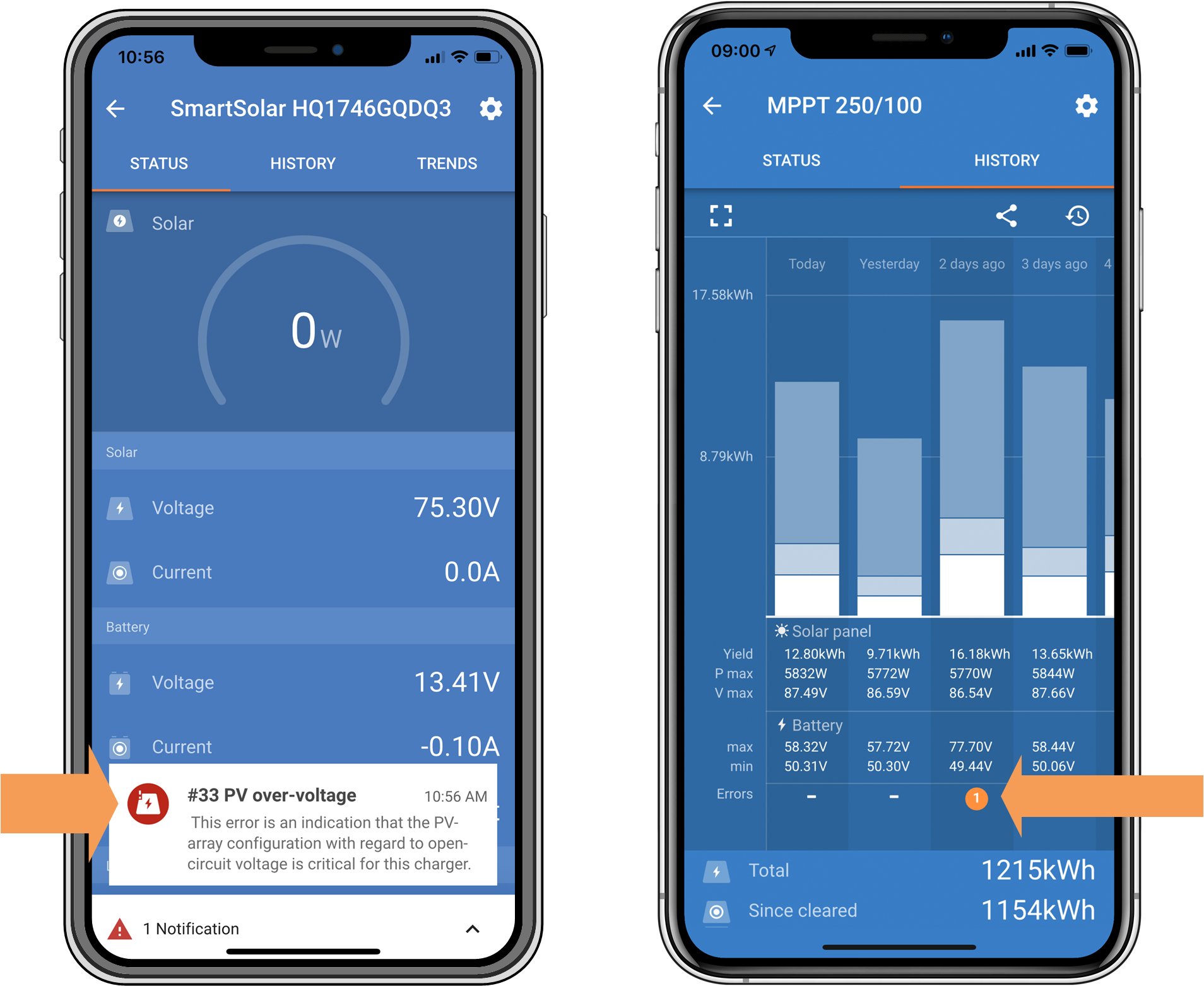 Cette erreur indique que la configuration du réseau PV en ce qui concerne la tension en circuit ouvert est critique pour ce chargeur. Vérifiez la configuration, et le cas échéant, réorganisez les panneaux.