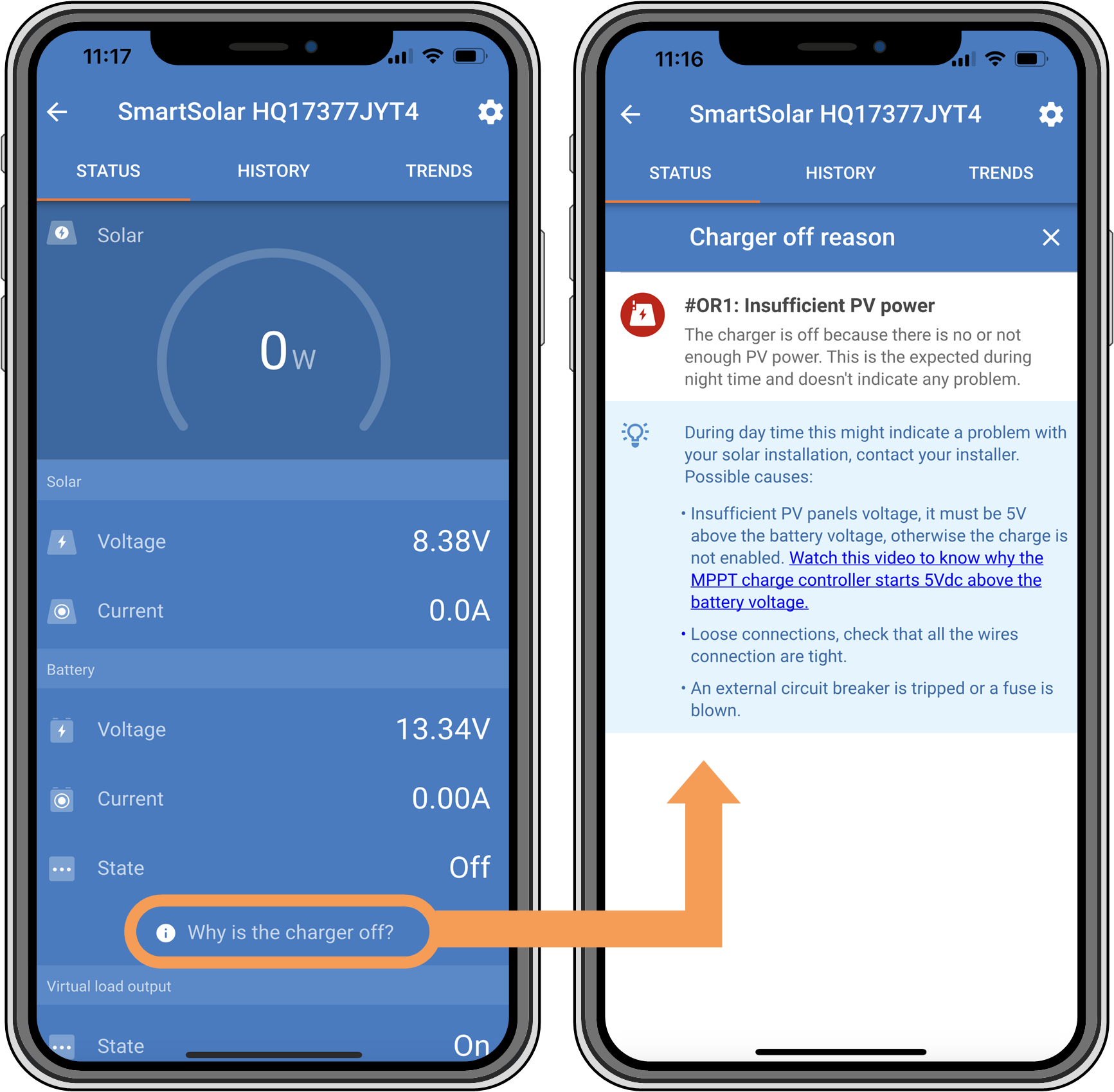 Lorsque le chargeur solaire est éteint, l’application VictronConnect l’indique sur l’écran d’état. Cliquez sur le texte « Pourquoi le chargeur est-il éteint ? » pour afficher une fenêtre contextuelle avec une explication et des solutions possibles.