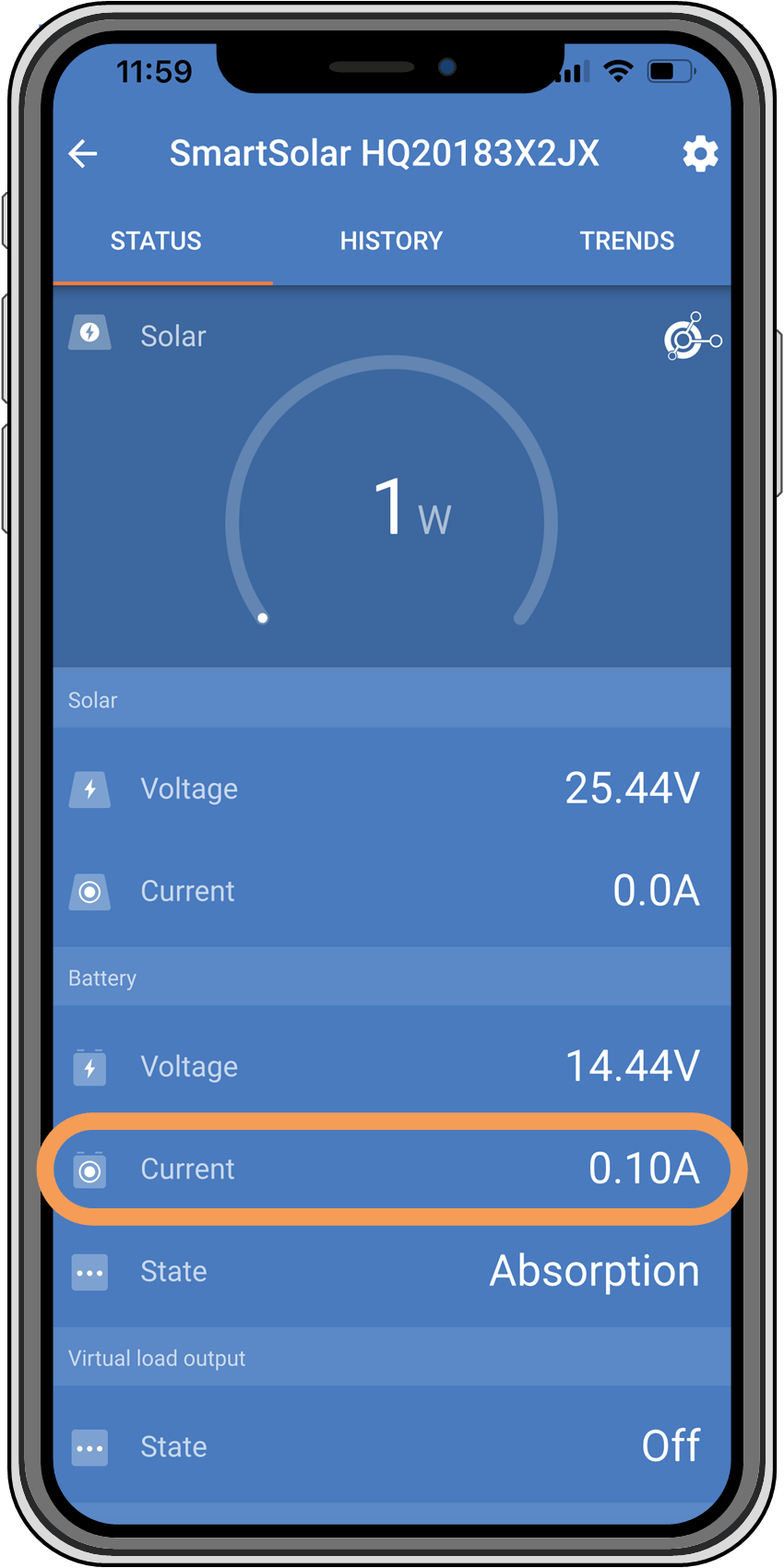L’application VictronConnect indique un courant de charge proche de zéro.