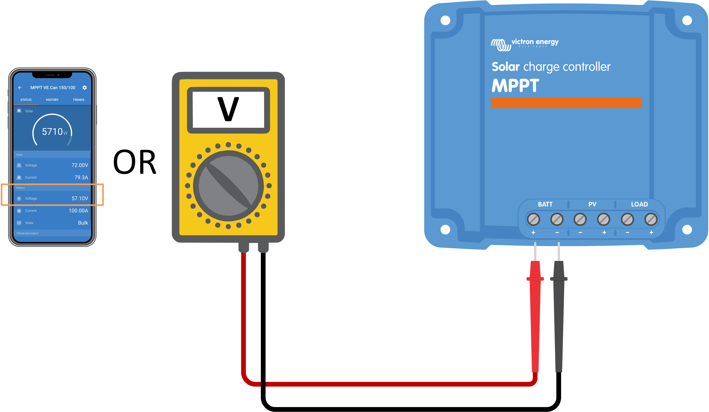 Phase 1 | Utilisez l’application VictronConnect, un écran de chargeur solaire ou un dispositif GX pour vérifier la tension de la batterie et la tension PV. | |