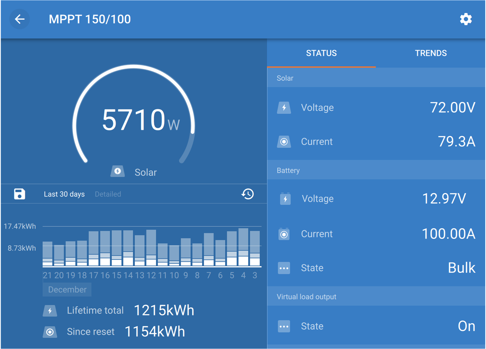 Captură de ecran cu aplicația VictronConnect, cu afișarea datelor în timp real și a datelor istorice.