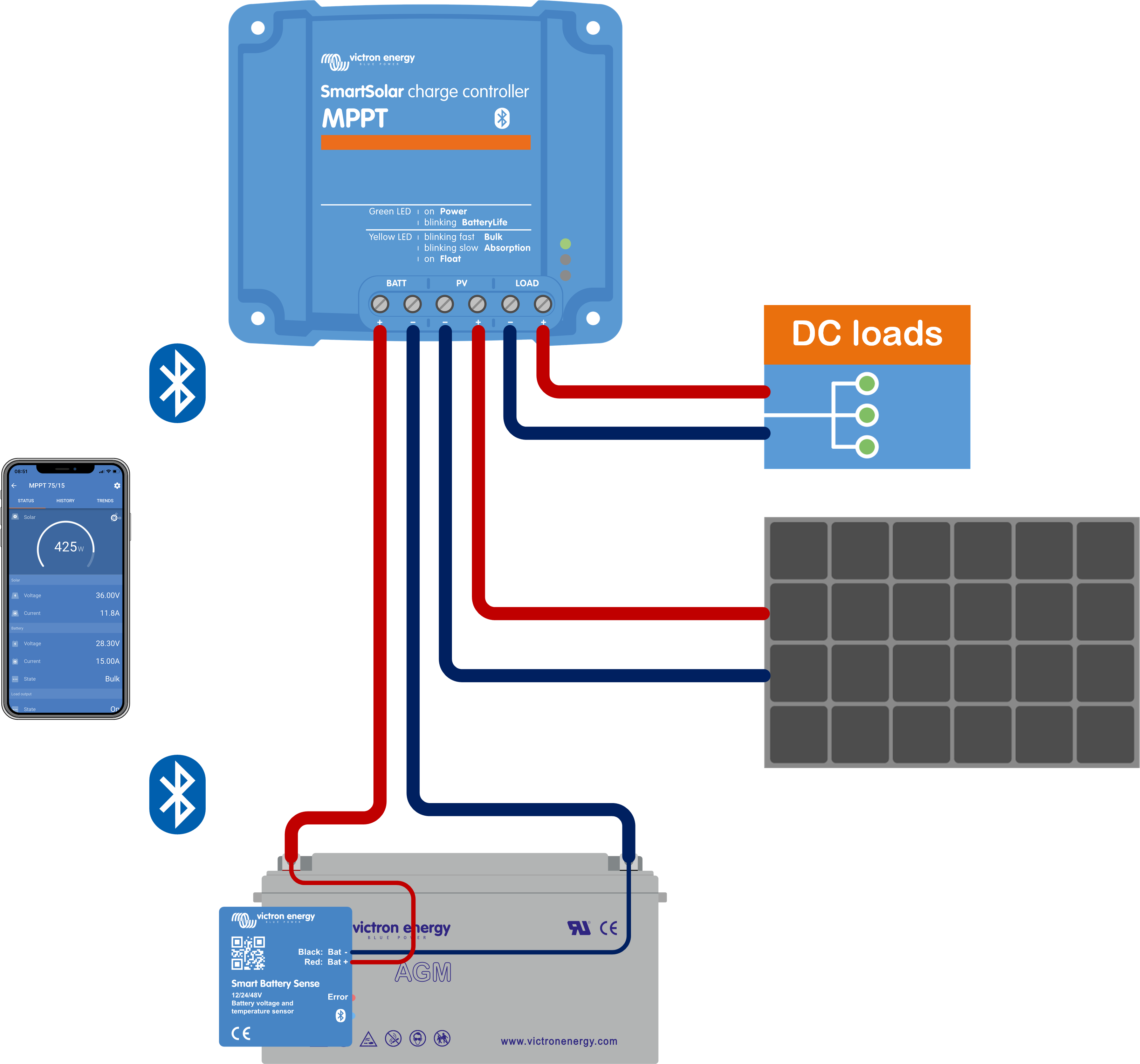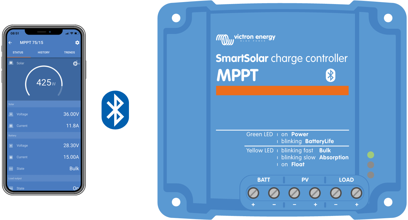 Un Rilevatore Smart Battery o un monitor della batteria opzionale misura la tensione del morsetto batteria e la invia al caricabatterie solare tramite Bluetooth, utilizzando la rete VE.Smart. Se la tensione batteria è inferiore alla tensione di carica del caricabatterie solare, quest’ultimo aumenterà la sua tensione di carica per compensare le perdite di tensione.