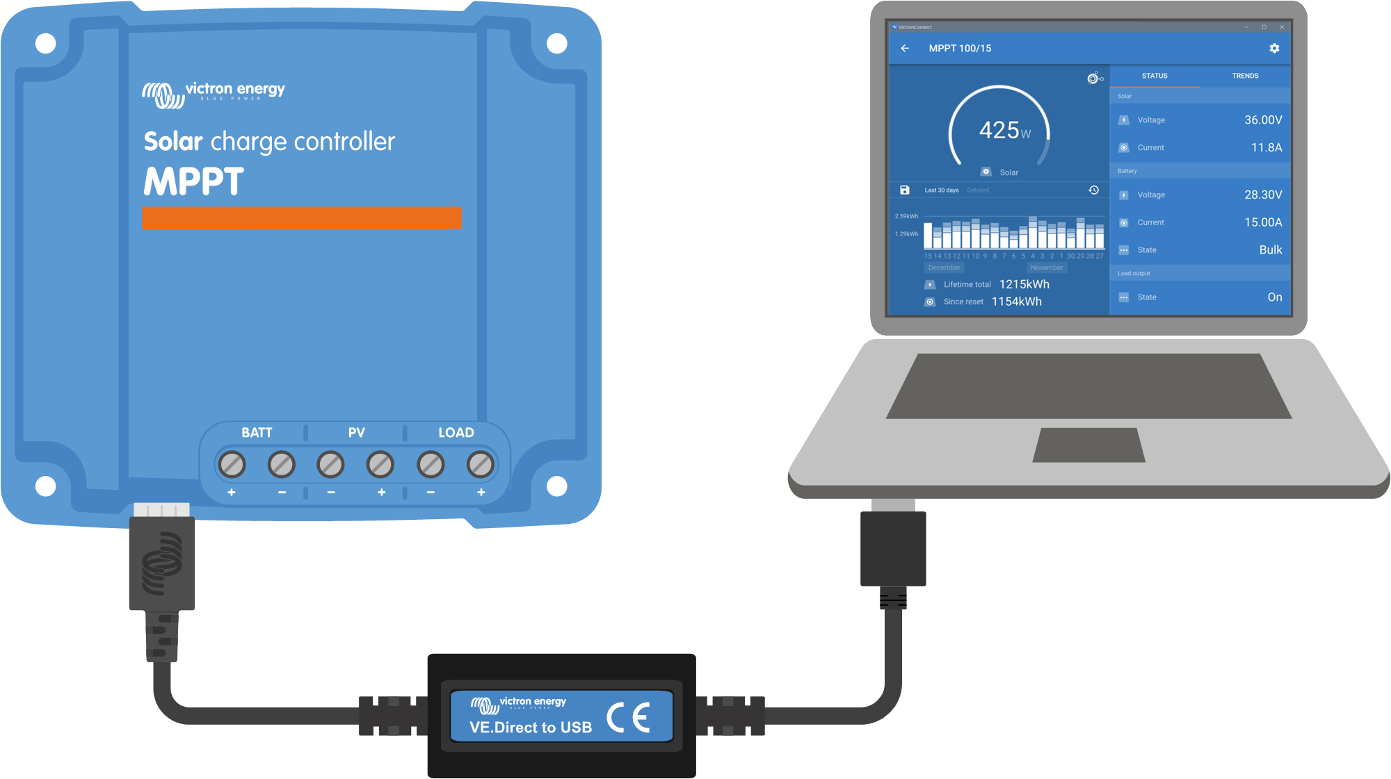 Tramite USB, utilizzando il l’interfaccia VE.Direct USB opzionale.