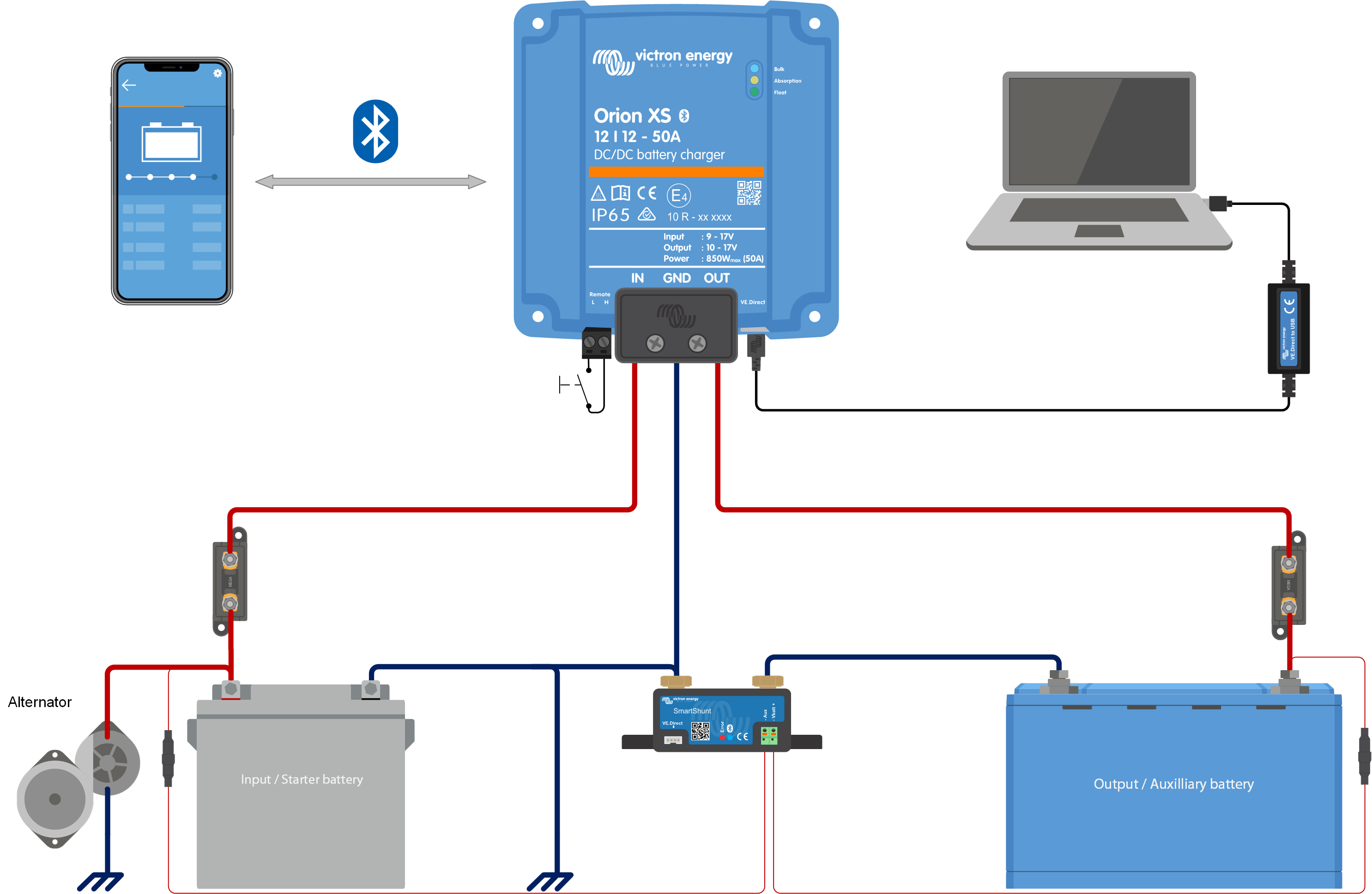 Wenn die Motorabschaltungserkennung in Victron Connect ausgeschaltet wurde („Zwangsladen“), wird Strom aus der Starterbatterie gezogen, auch wenn der Motor nicht läuft.