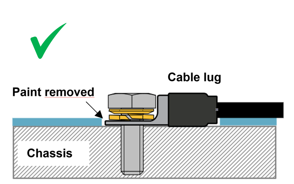 In veel gevallen is de GND-aansluiting via een kabelschoen aangesloten op het chassis. Voor een lage impedantie-aansluiting moet de kabelschoen rechtstreeks contact hebben met het metaal van het chassis, het contactoppervlak moet daarom vrij van verf zijn, raadpleeg onderstaande afbeeldingen.