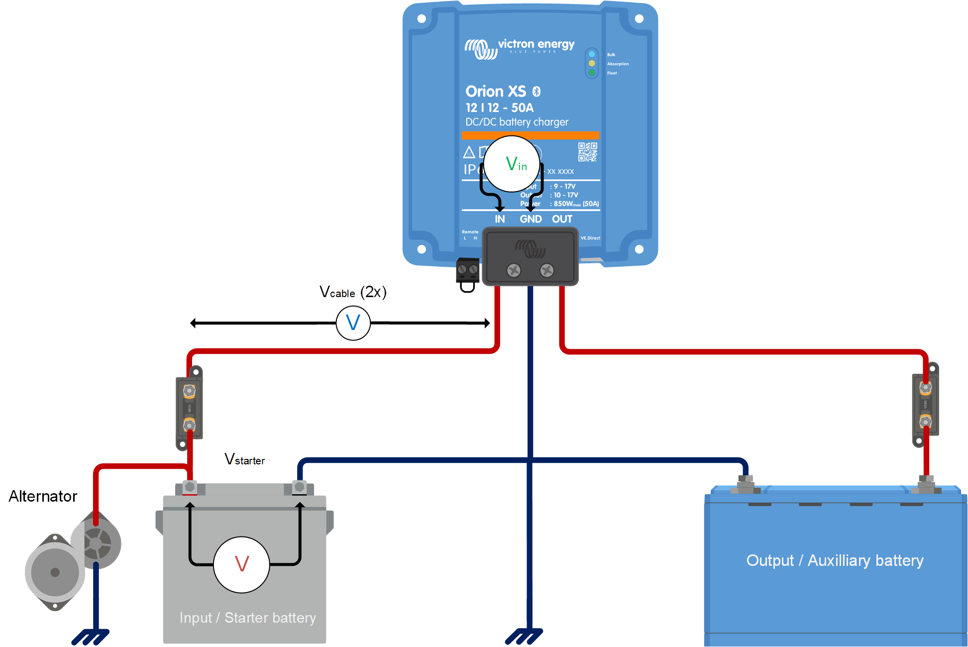 Den avlästa batterispänningen används för att kompensera för spänningsbortfall över batterikablarna. Kompensation för spänningsbortfall skapar en missanpassning mellan den spänning som uppmätts vid Orion XS-kontaktdonet och batterianslutningarna.