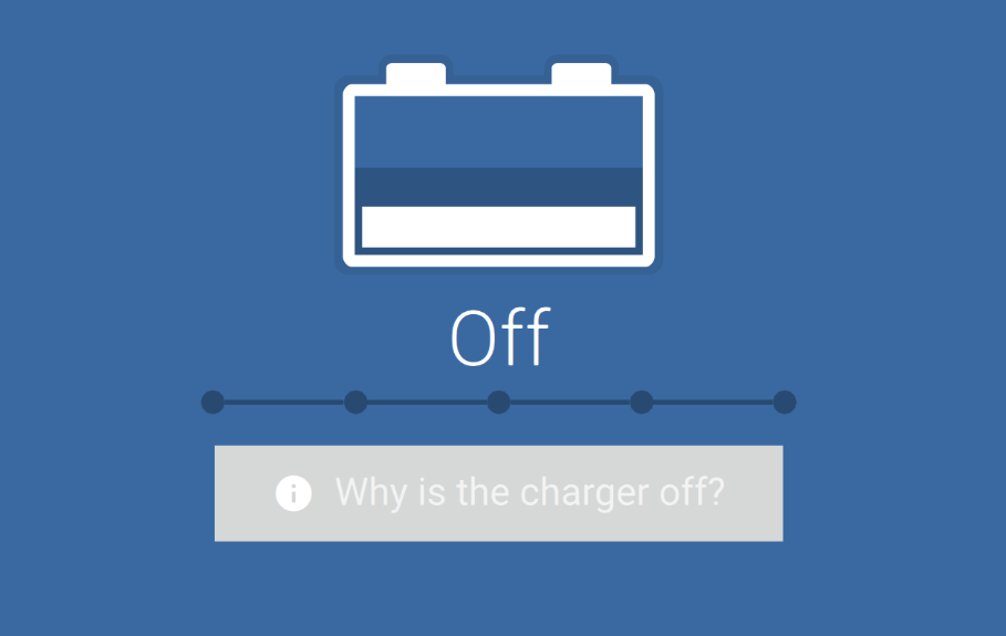 Varför är laddaren avstängd? Visas under batterisymbolen och visar anledningen till varför Orion XS är avstängd. |