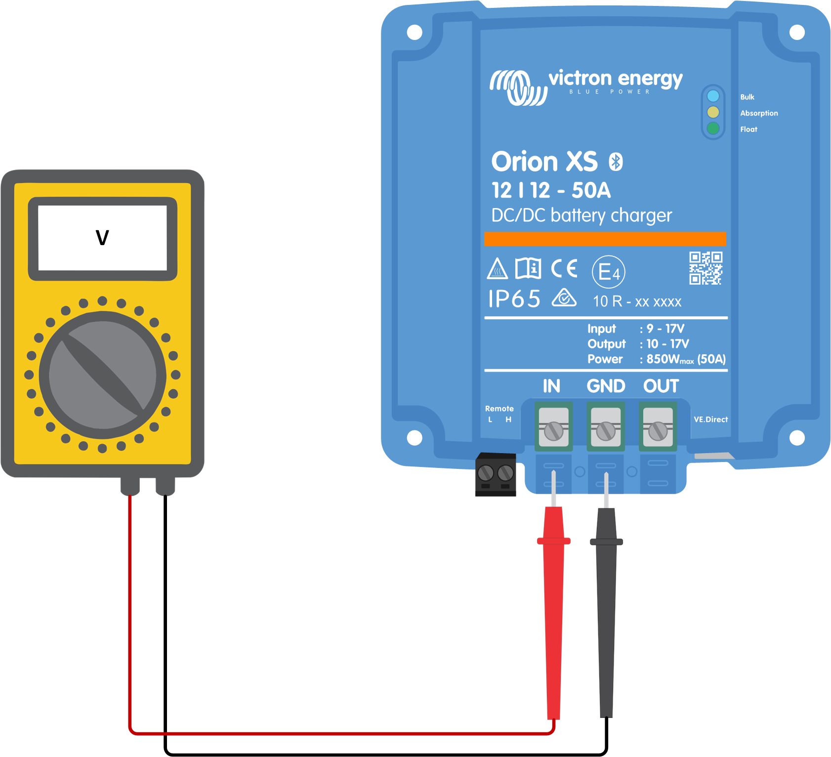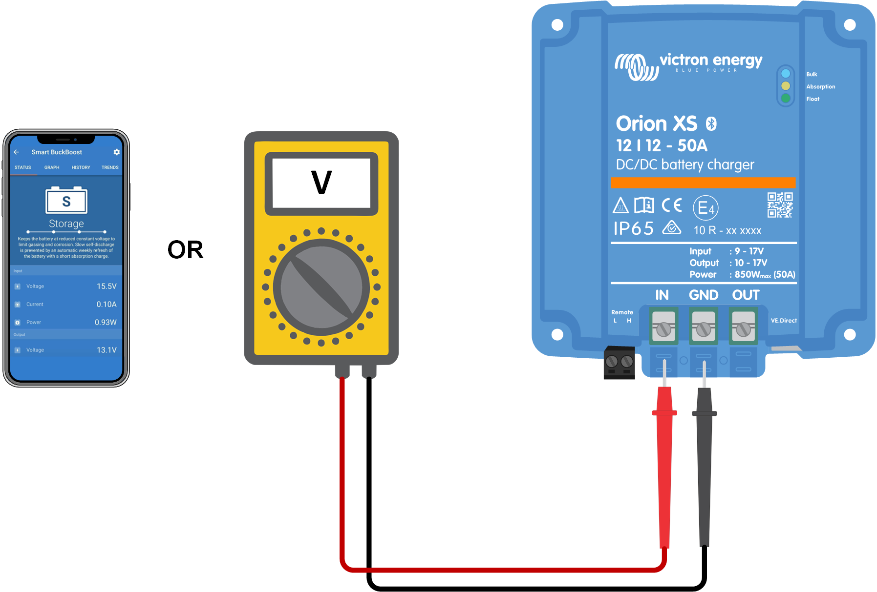 Batterispänning kan oftast kontrolleras via appen VictronConnect, en skärm eller en GX-enhet. I det här fallet fungerar dock inte laddaren så batterispänningen måste mätas manuellt. Mät batterispänningen vid laddarens batterianslutningar genom att använda en multimeter.