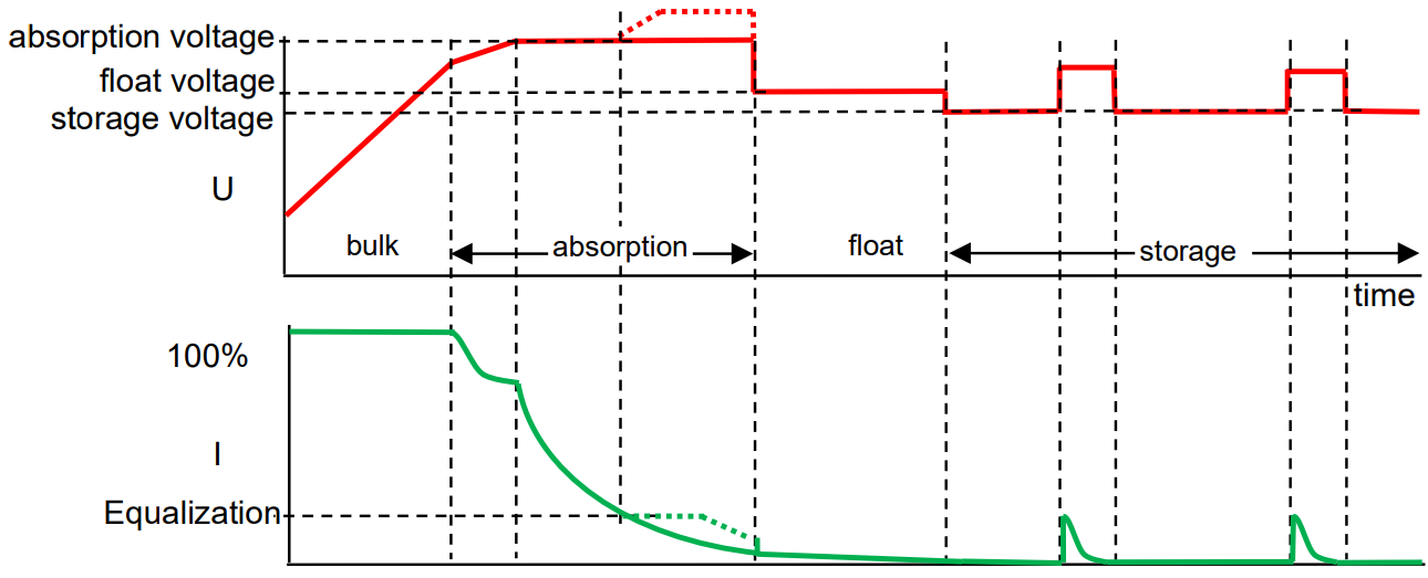 Ingås när laddaren startas eller när batterispänningen sjunker under 13,5 V/ 27,0 V (på grund av hög belastning) i minst 1 minut. Konstant ström läggs på tills absorptionsspänning uppnås (14,2 V/ 28,4 V).