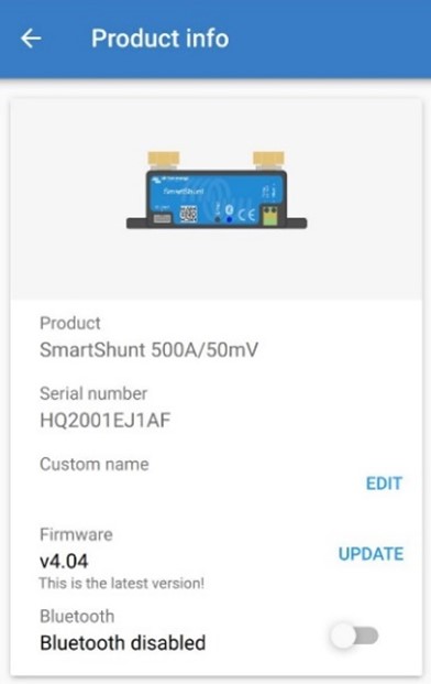 Vid den första installationen rekommenderas det alltid att uppdatera till den senaste versionen av den fasta programvaran (om tillgänglig). När du ansluter till batteriövervakaren med en uppdaterad version av appen VictronConnect kommer den att kontrollera den fasta programvaran, och om det finns en nyare version kommer den att be dig uppdatera den. Appen VictronConnect innehåller de faktiska filerna för den fasta programvaran, så en internetanslutning behövs inte för att uppdatera till den senaste fasta programvaran så länge du använder den senaste versionen av appen VictronConnect.