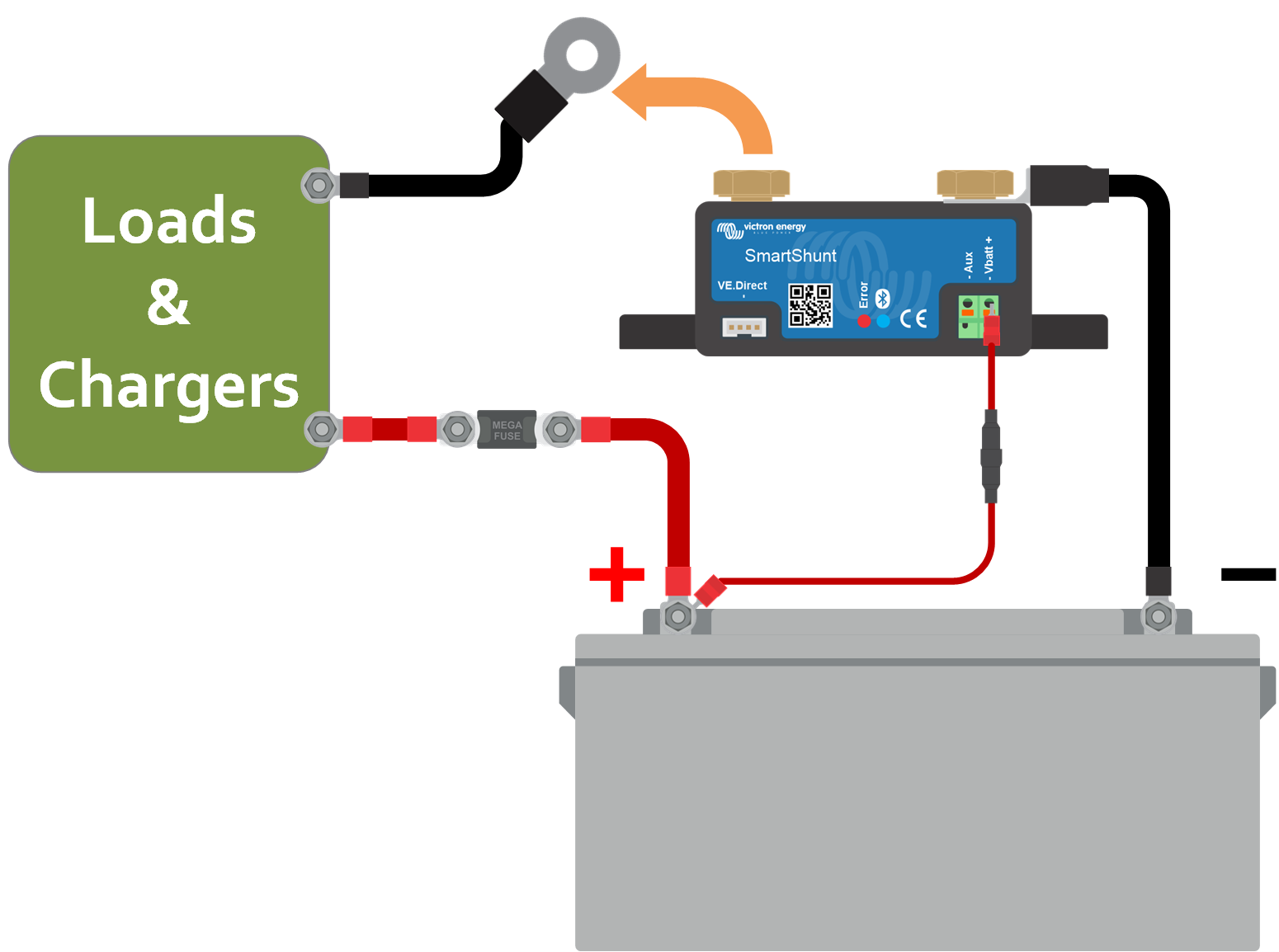 Omvänt läge: batteriets negativa pol är ansluten till shuntens belastnings-anslutning.