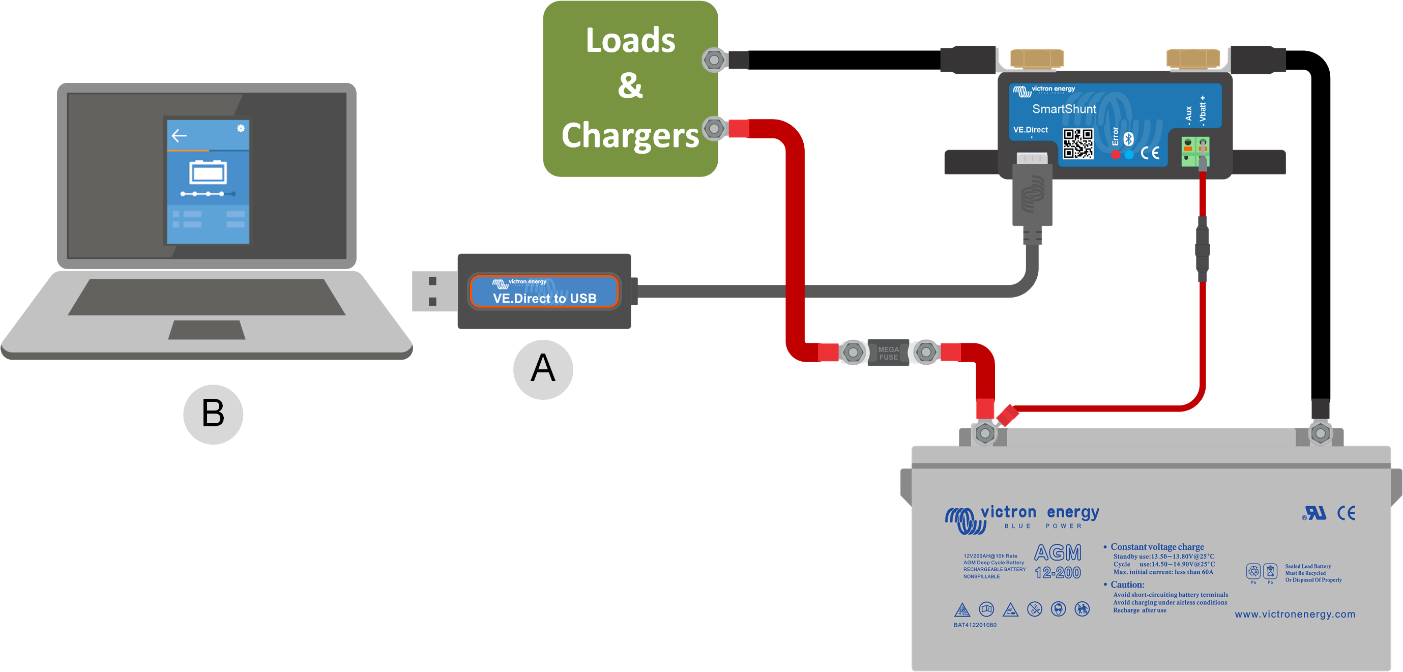 VictronConnect kan inte bara anslutas via Bluetooth utan också via USB. En USB-anslutning är nödvändig för att ansluta till Windows-versionen av VictronConnect och valfri om du använder MacOS eller Android-versionerna. Observera att om du ansluter till en Android-telefon eller surfplatta kan du behöva en ”USB on the Go”-kabel.