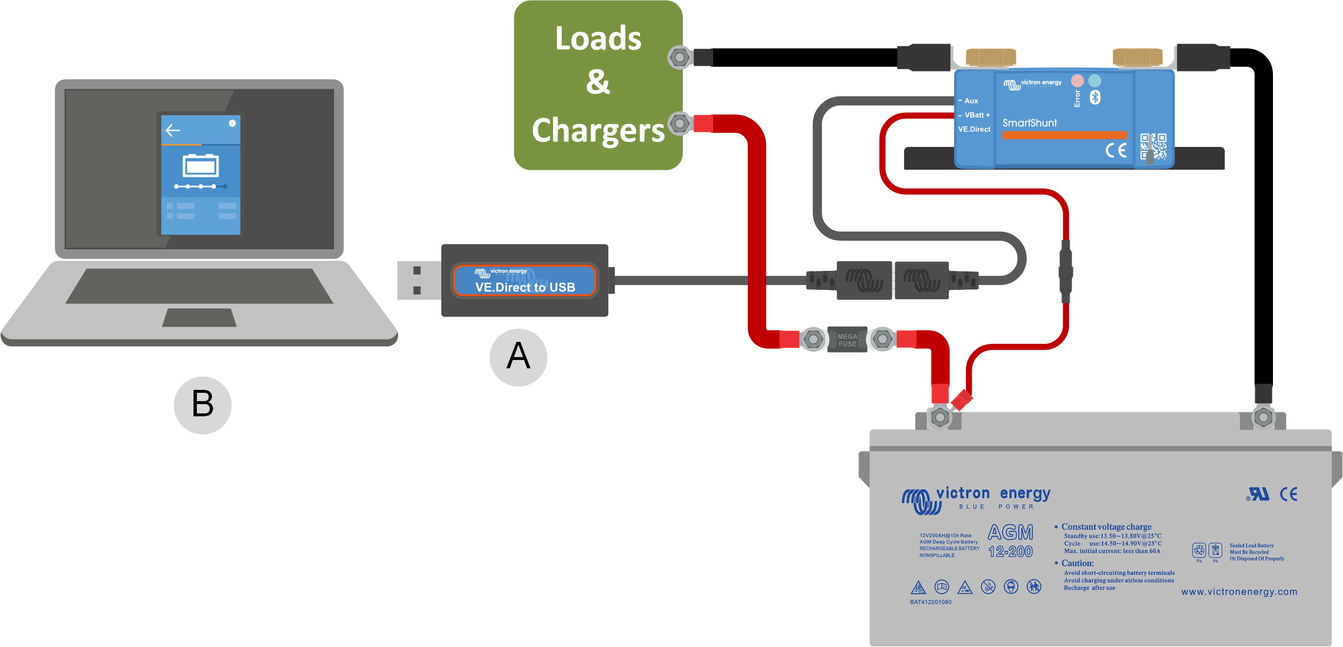 De accumonitor kan met een VE.Direct-kabel worden aangesloten op een GX-apparaat. De VE.Direct-kabels zijn verkrijgbaar in lengtes variërend van 0,3 tot 10 meter en zijn verkrijgbaar met rechte of haakse connectoren. Alternatief kan de accumonitor ook verbinding maken met een GX-apparaat via de VE.Direct-naar-USB-interface.