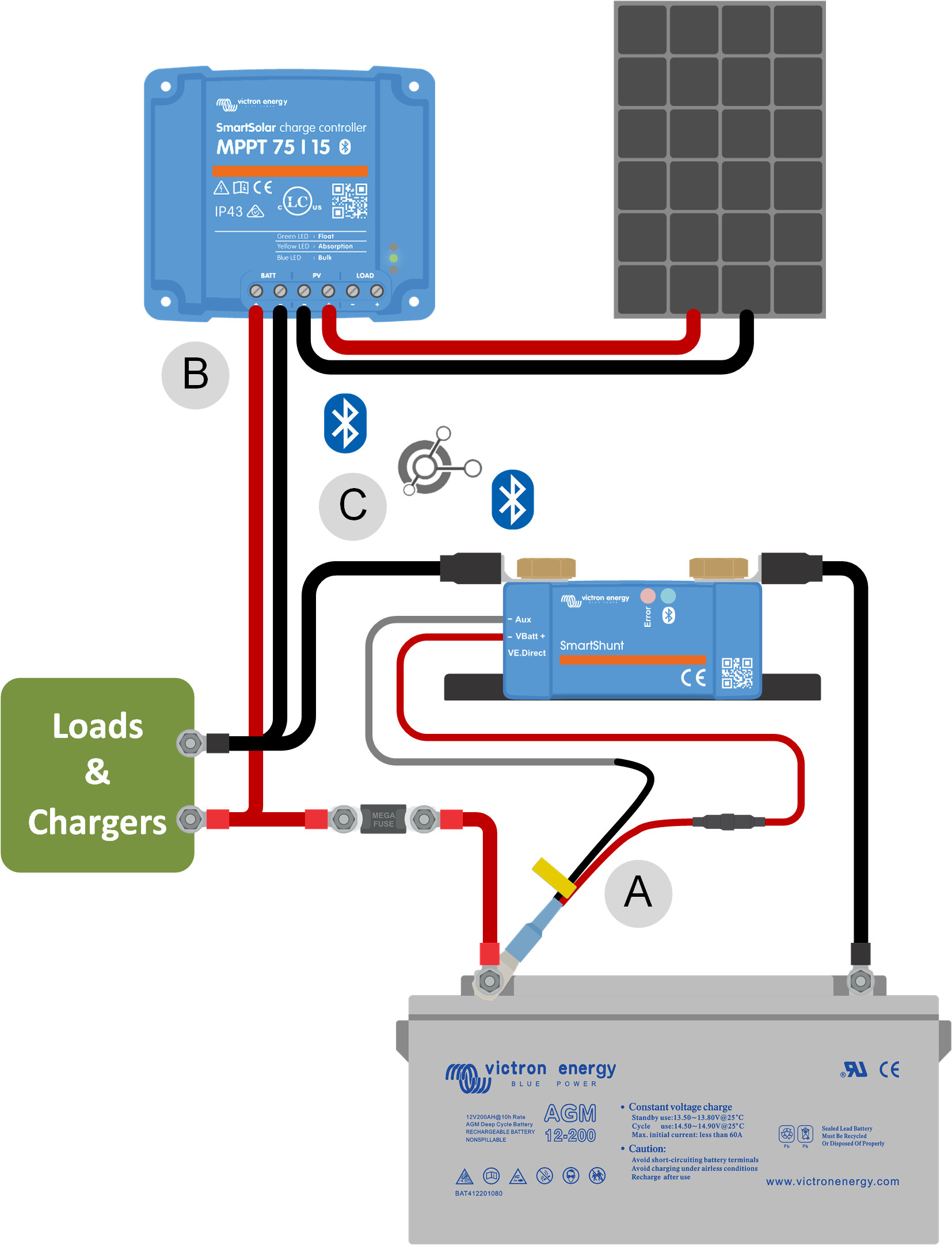 Voorbeeld van een systeem met een accumonitor met een temperatuursensor en een PV-lader, beiden maken gebruik van VE.Smart networking.