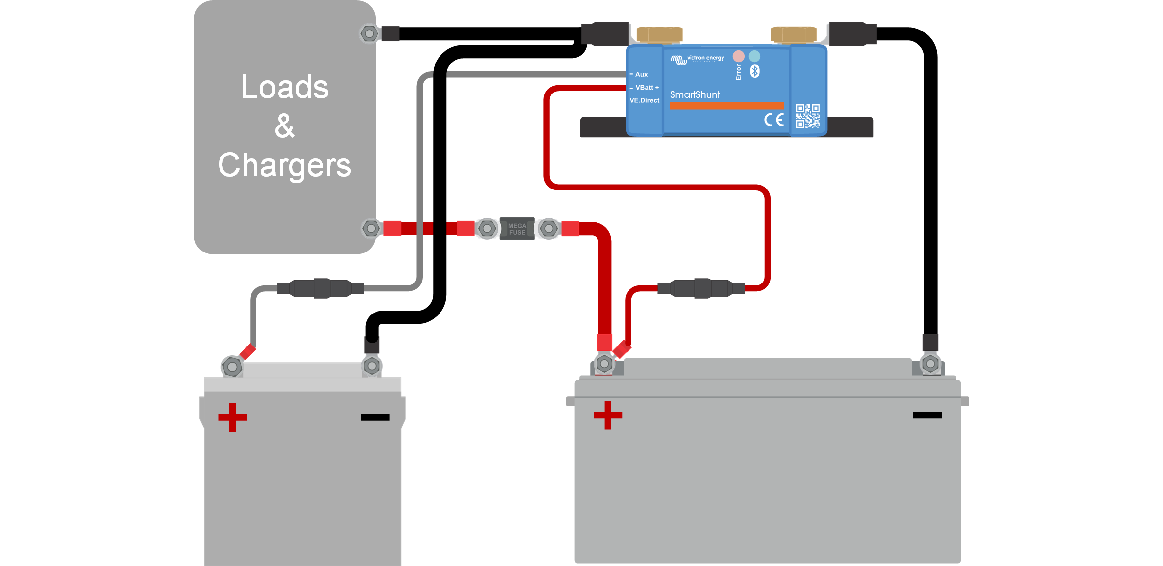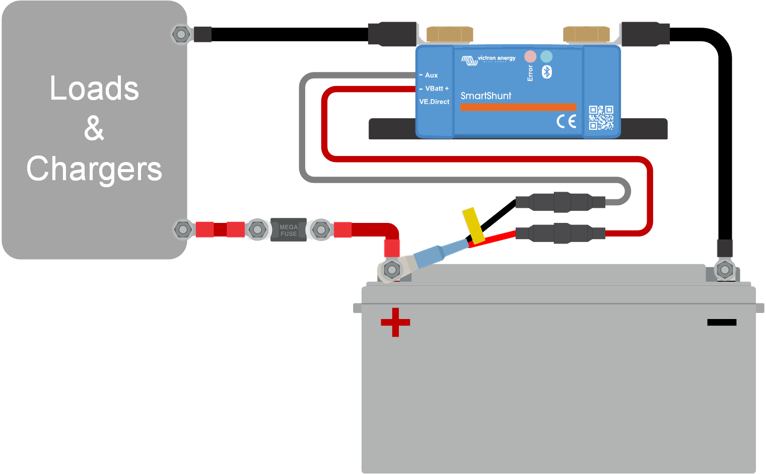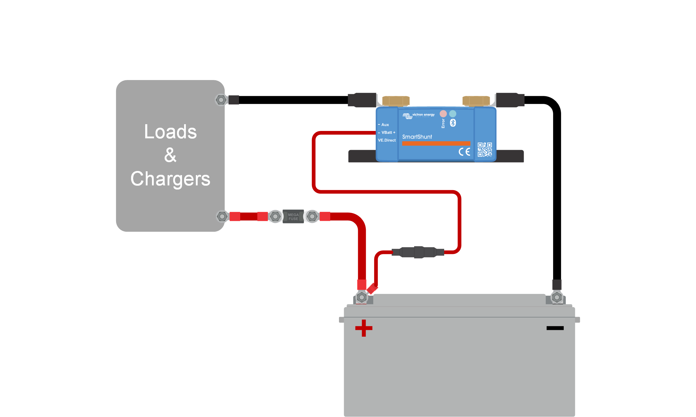 Rețineți că în această parte a șuntului, respectiv la borna negativă a bateriei nu trebuie să existe alte racorduri. Orice consumatori sau încărcătoare conectate aici vor fi excluse din calcularea stării de încărcare a bateriei.