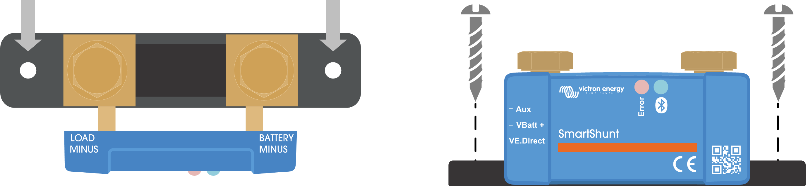 SmartShunt este prevăzut cu două găuri de 5,5 mm pentru montare, acestea fiind localizate la baza dispozitivului. Găurile pot fi folosite pentru înșurubarea sau fixarea SmartShunt pe o suprafață dură (șuruburile nu sunt incluse).