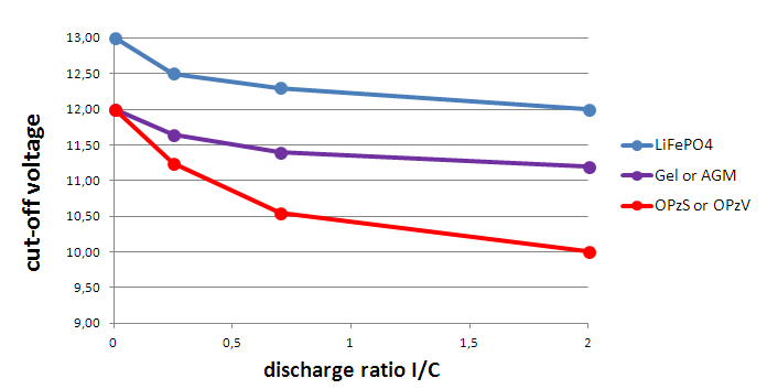 La fonction de « coupure dynamique » est très utile pour les batteries ayant une résistance interne élevée, comme les batteries OPzV et OPzS. Elle est un peu moins utile pour les batteries GEL et AGM et peut-être même sans intérêt pour les batteries au lithium. Le graphique ci-dessous montre la courbe du taux de décharge en fonction de la tension de la batterie pour les différents types de batteries. Vous pouvez voir que la courbe des batteries au lithium (LiFePO4) est presque plate par rapport à la courbe OPzV et OPzS.