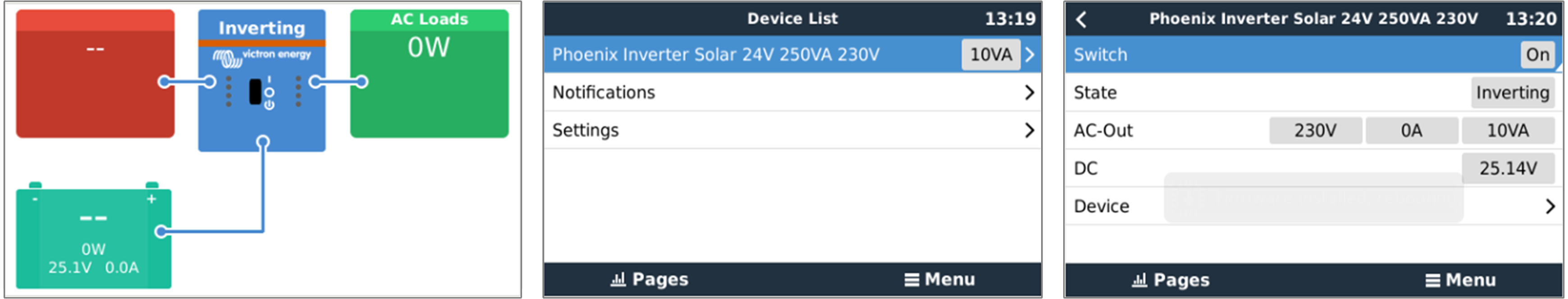 Exemples d’écrans du dispositif GX de gauche à droite : écran système, liste des appareils et écran du convertisseur.